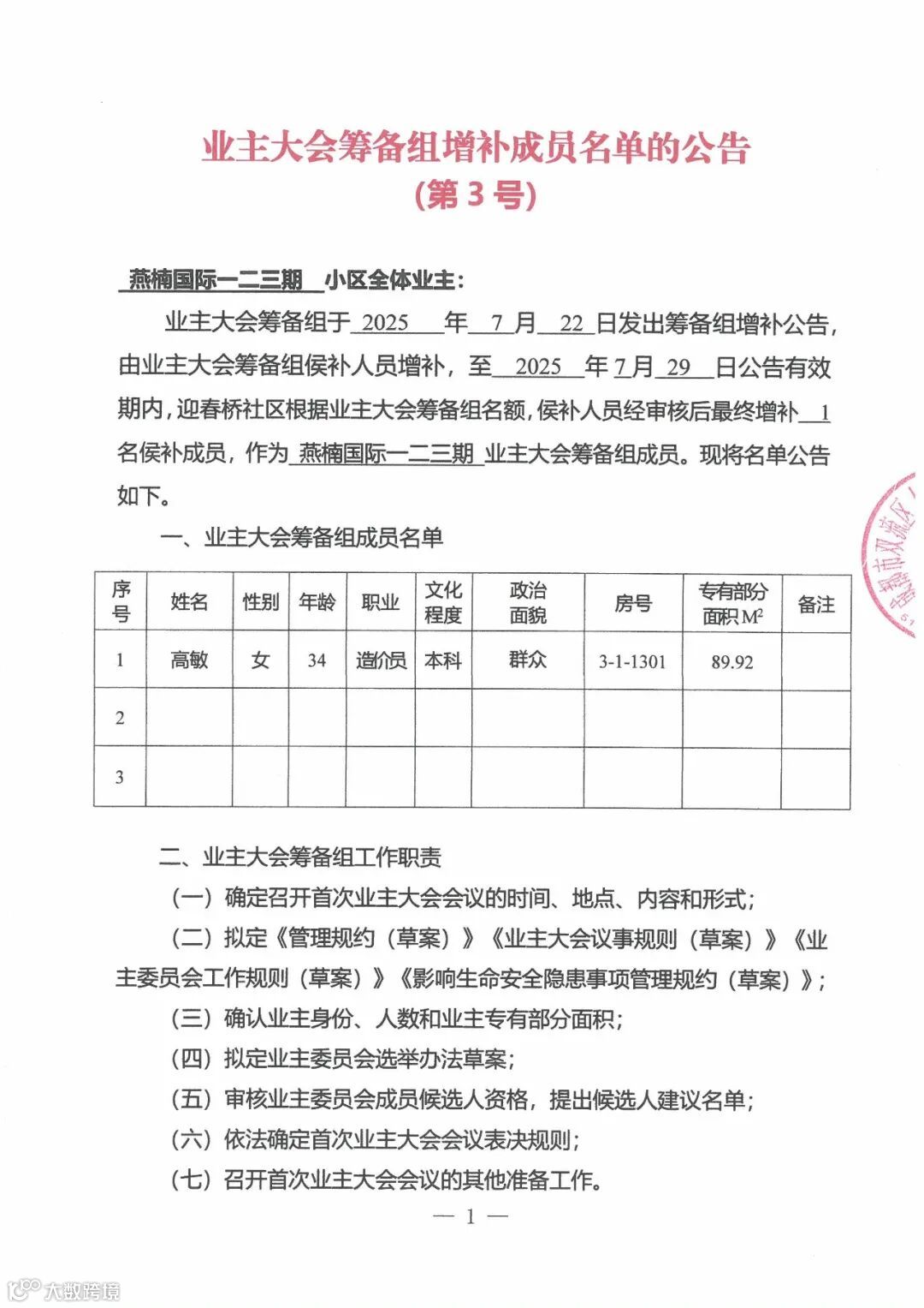 1、《业主大会筹备组增补名单公告》(第3号)发布,涉及筹备组成员增补。