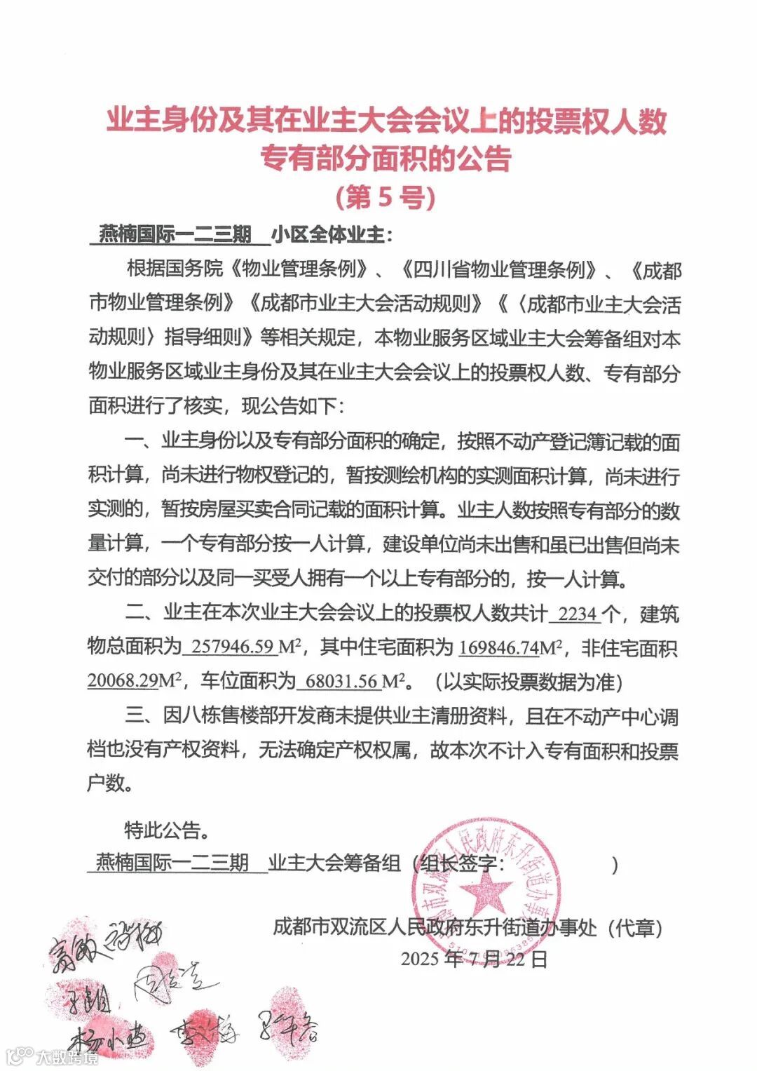 2、《业主身份及其在业主大会会议上的投票权人数专有部分面积的公告》(第5号)发布,涉及小区专有面积和投票权人数公示。