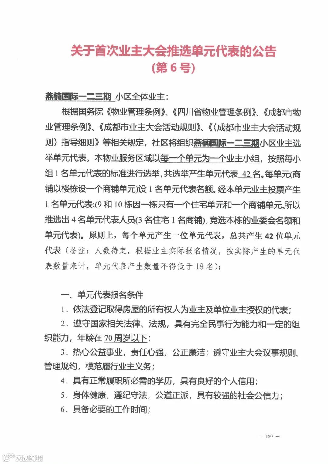 3、《关于首次业主大会推选单元代表的公告》(第6号)发布,涉及小区单元代表报名和选举细则。