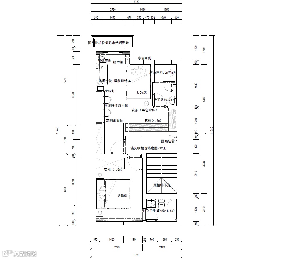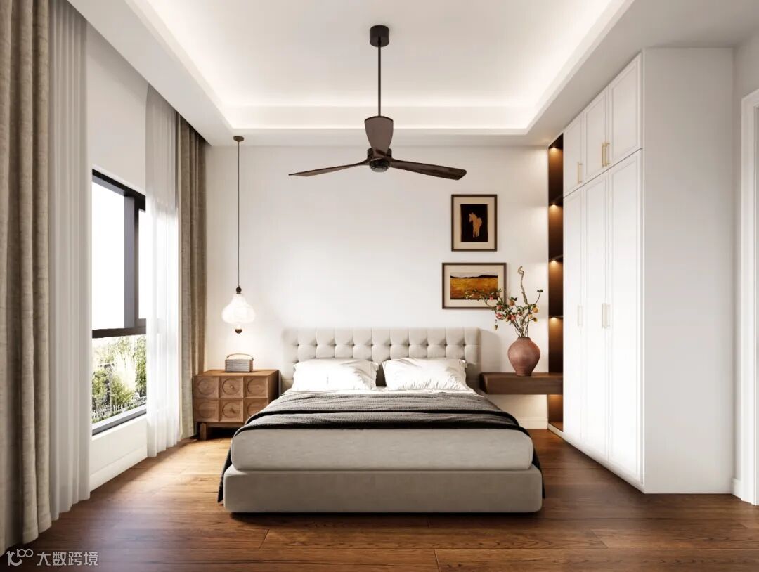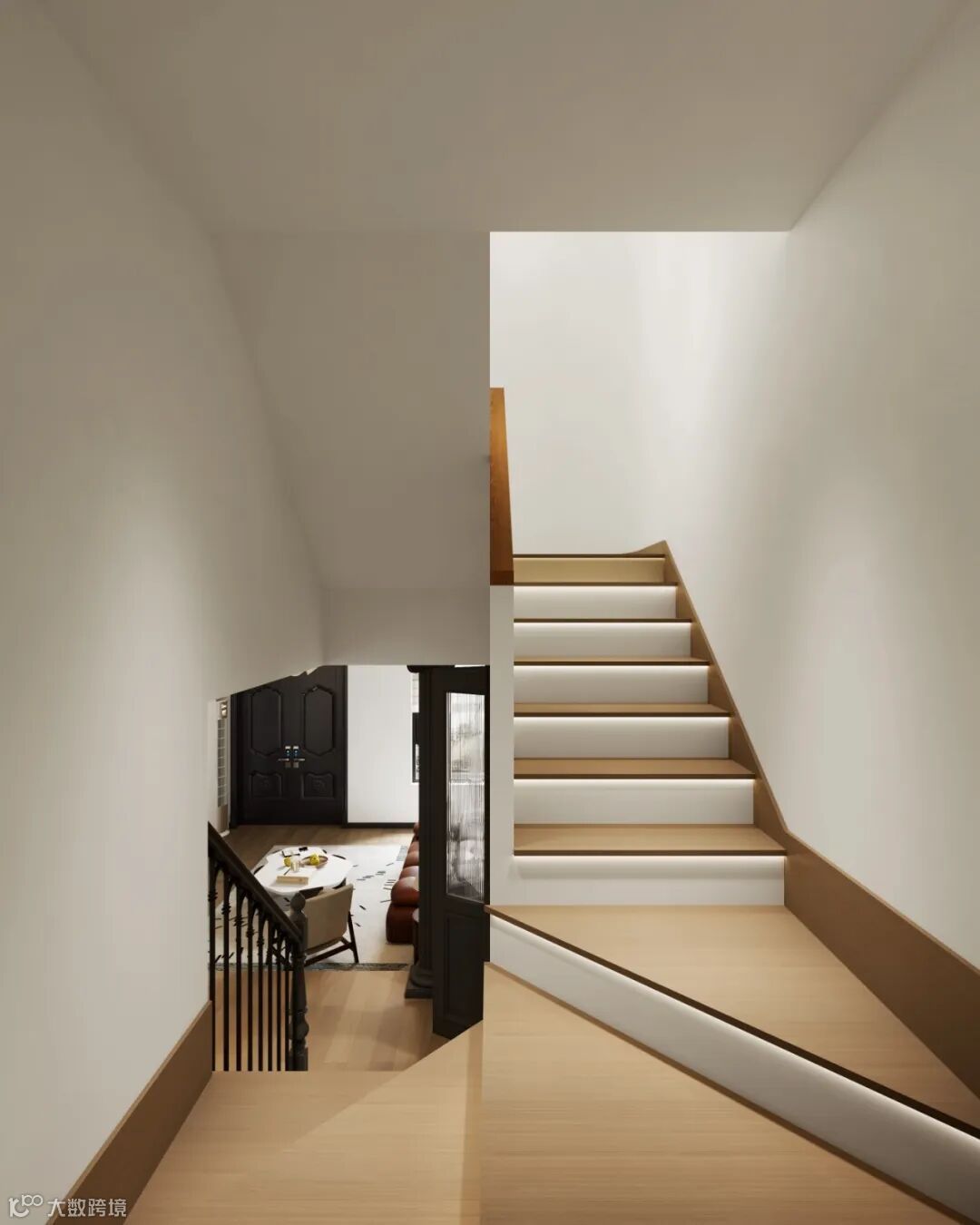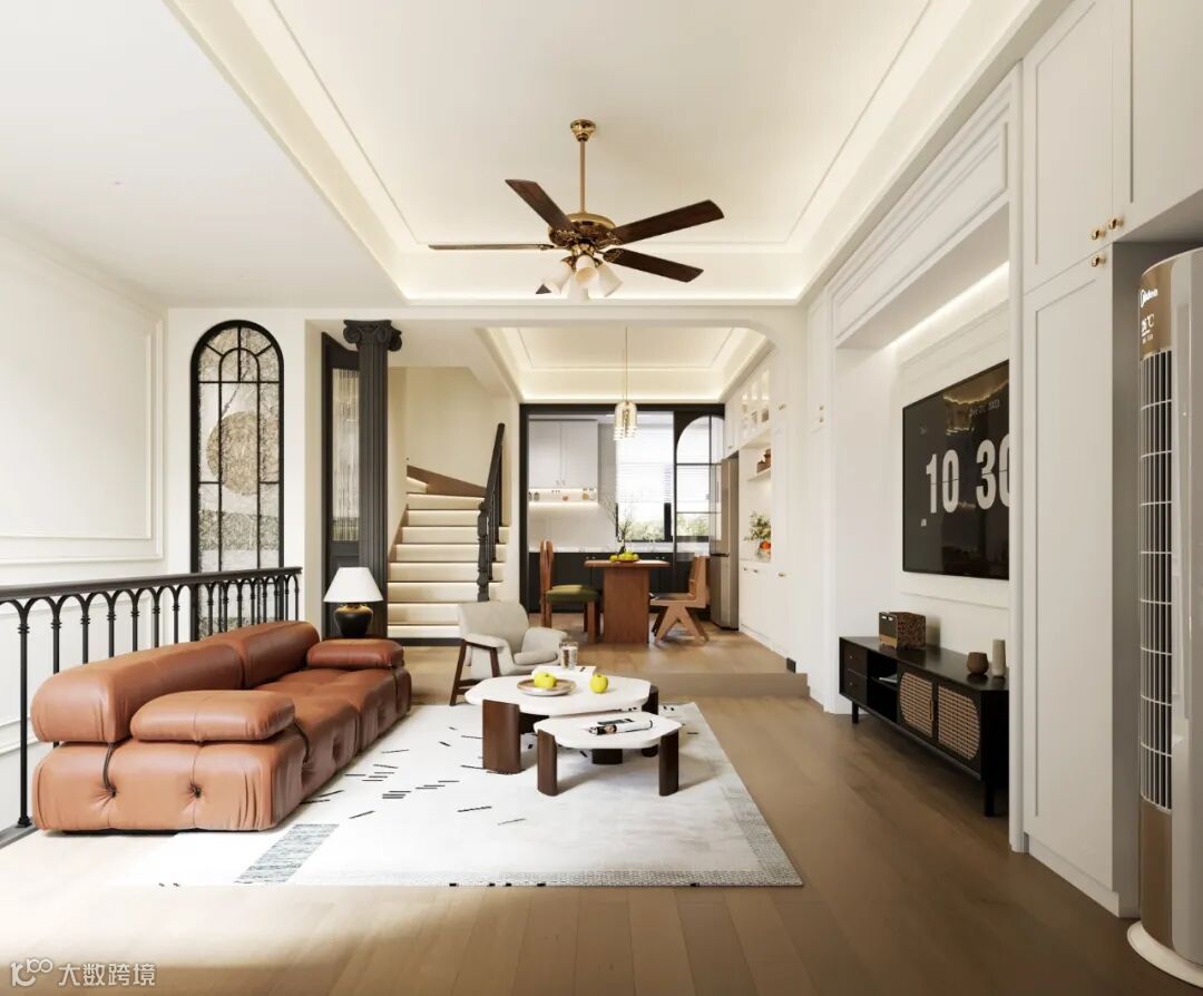 三楼首先是保留了天井采光结构,因为房屋是边户+长方形结构,南北有阳台,但东西两边是没有窗户采光的,所以天井采光就非常重要,一定要保留下来,这样使得空间的光线充足,更加明亮,同时也能拥有别墅的居住体验。