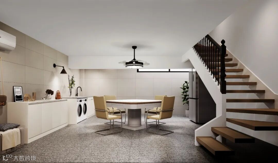 一层的功能是客厅+餐厨房,原始户型是卫生间在厨房里,相对来说有些不合理。我们通过负一楼的楼梯移位,可以空出一个楼梯间的位置,这个地方改成了卫生间,既解决了布局不合理的问题,也增大了厨房和餐厅的区域。这样使得空间优化更加合理。