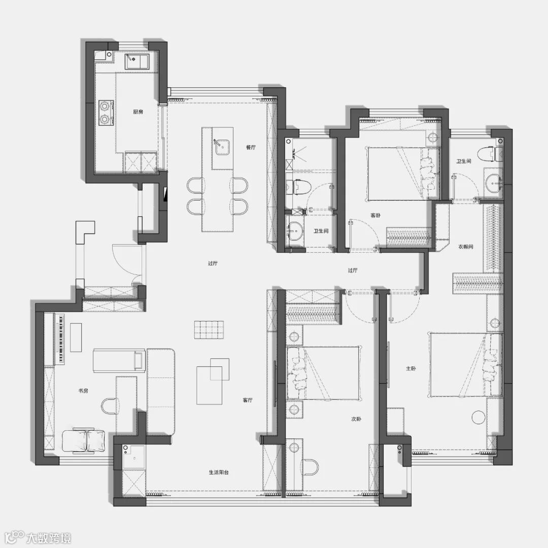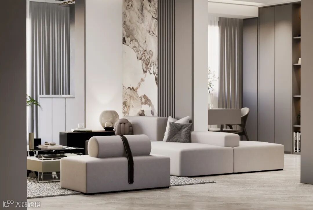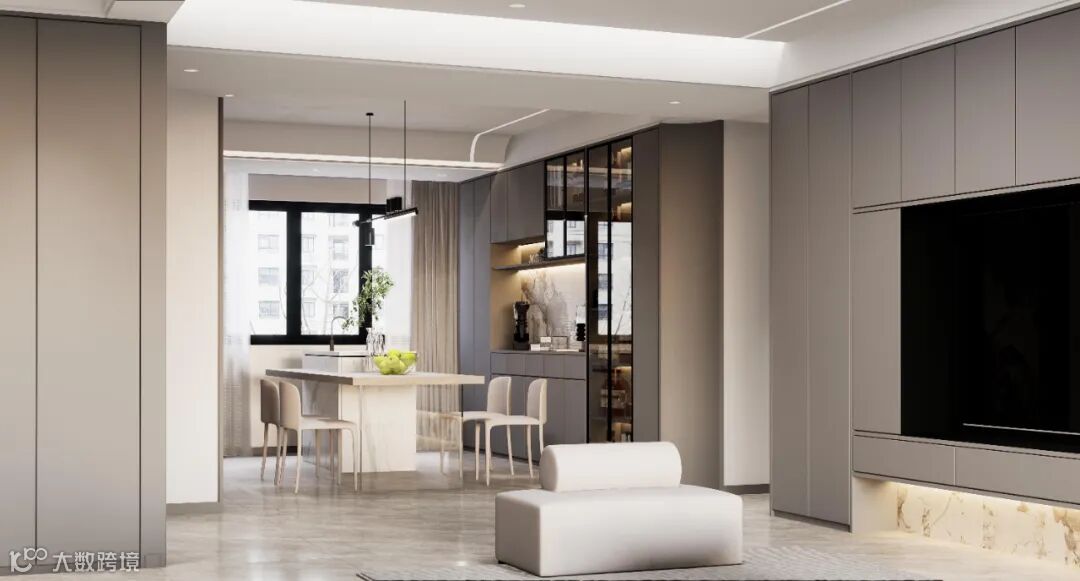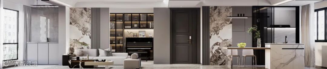 在自由通透的整体空间中,客餐厅连为一体,扩大了横向视野,而是通过合理的布局与材质,达到一种看似分散却又互相关联交融的自由状态。