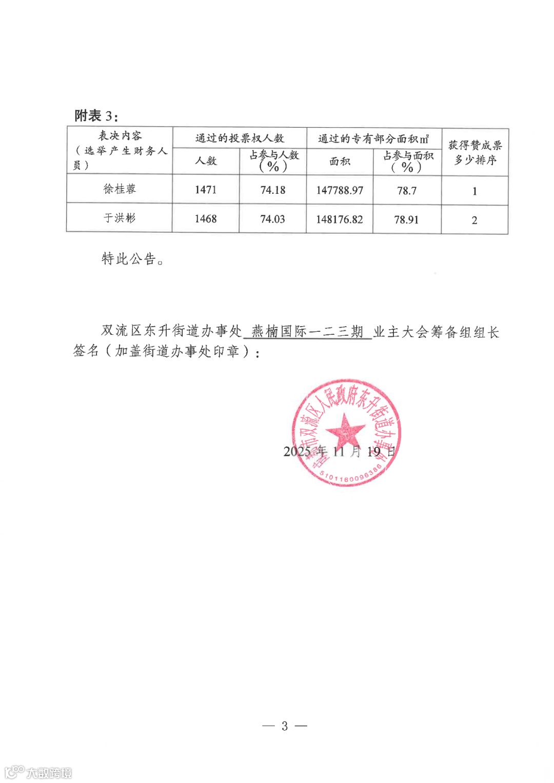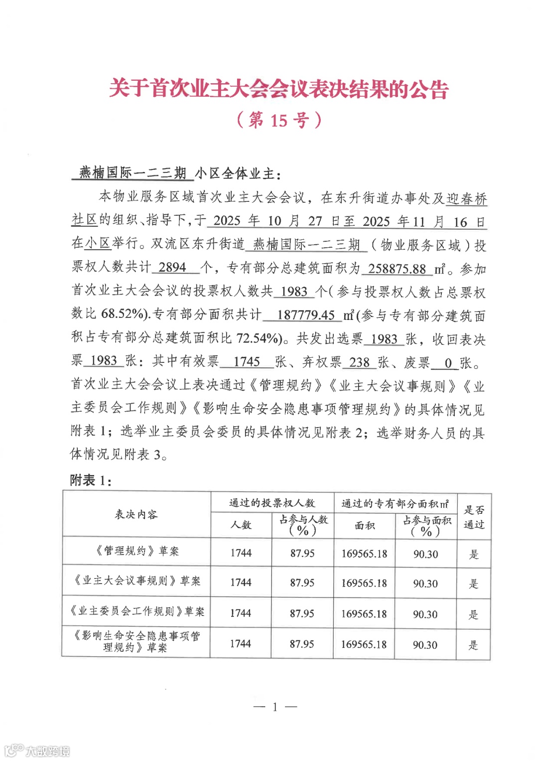 大家好!在全体业主的共同努力下,首次业主大会已顺利召开,《关于首次业主大会会议表决结果的公告(第15号)》已发出,粘贴于三个大门口公告栏敬请全体业主关注!剩余程序公告筹备组将按街道指导稳步推进!愿燕楠国际在所有业主积极关注参与下焕新颜!