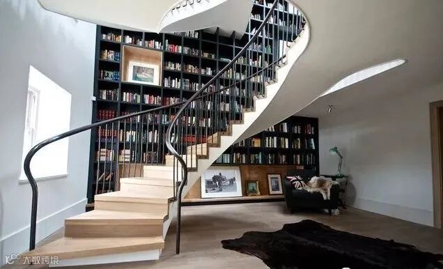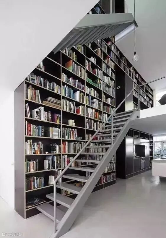 如果家里有楼梯,把书架做在楼梯的内侧也是一个很不错的想法。这样就更有一种藏书阁的感觉了。