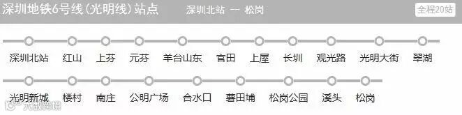 深圳6号线:即光明线,预计2020年通车。程东起深圳北站,西至松岗站,连接龙华、大浪、石岩、光明、公明、松岗等片区,全长37.7公里,共设车站20座,其中地下站5座(南庄站、公明广场站、山门站、溪头站和松岗站),高架站15座。换乘站6座(深圳北站、红山站、上屋北站、长圳站、荔林站、松岗站)。