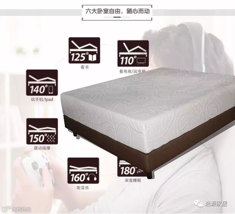 根据人体工程学在电动床架上设立5个身体分段关节点(也就是人体的弯折点),通过遥控操作,可随意调节床架角度,适应人体各个部位的弯曲角度,自由调节身体姿势,减轻颈部压力,端坐、后躺或仅将脚部升起以促进血液循环。