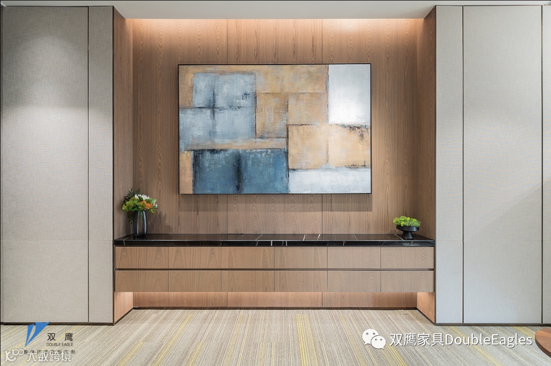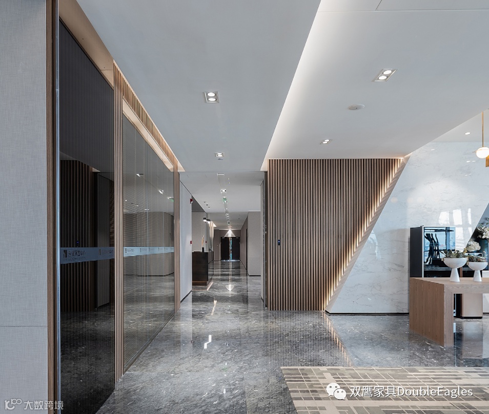 艺术不应该是高高挂起的作品,而应该注入更多的功能性需求;走廊空间中大面积透明的艺术玻璃提高了整体空间的纵深感,不同材质之间的相互折射,没有过多的装饰,让这一方公共区域处于最舒适的状态。
