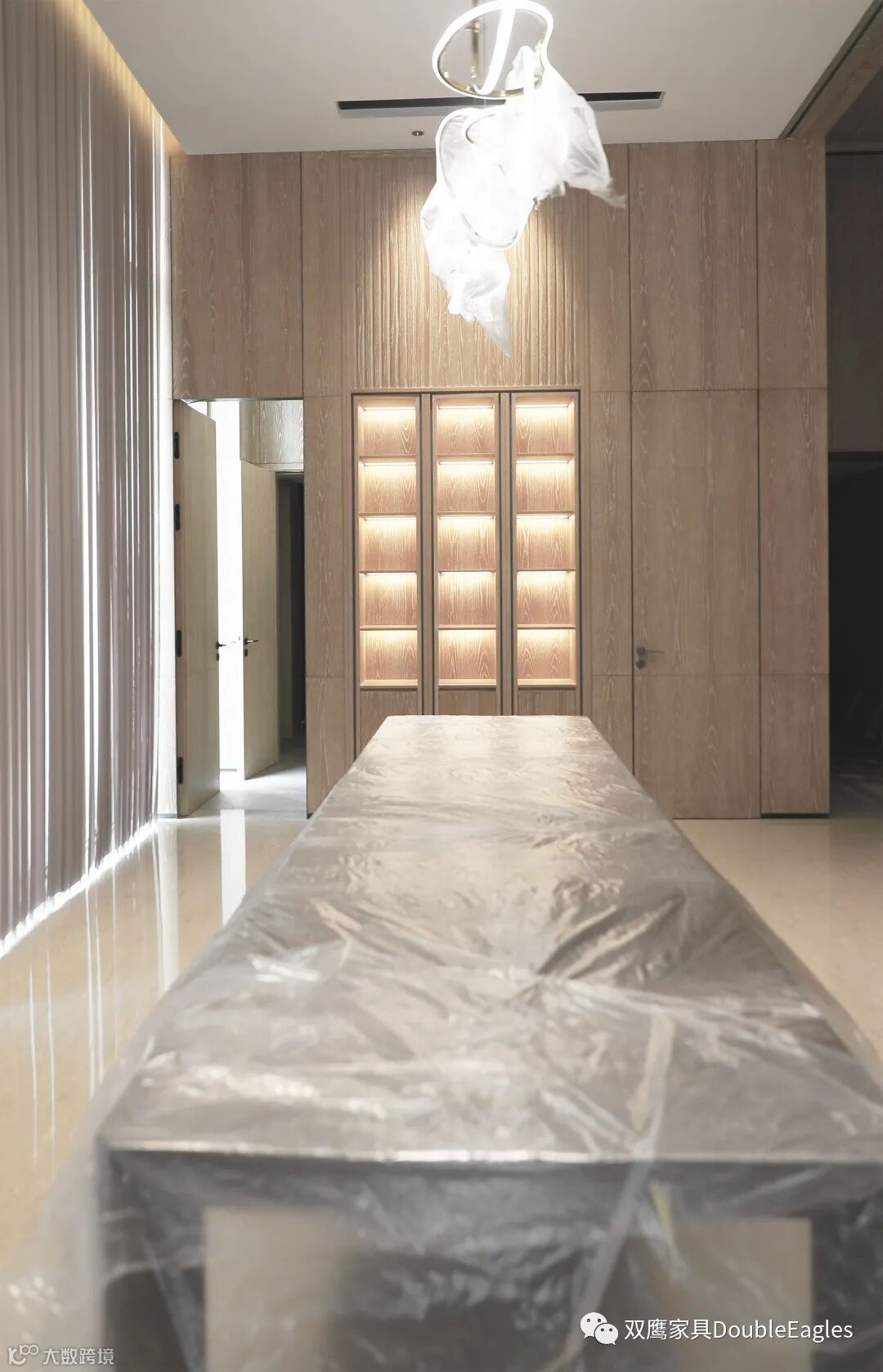 挑高的天花上,光影潋滟的水波纹与格栅天花及墙面相互映衬,设计师借无水之处生“水”,为艺术表达助兴,让人颇有一种无事此静坐,一日似两日的时空恍惚之感。