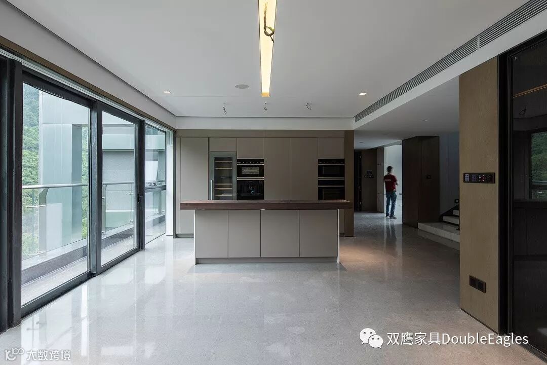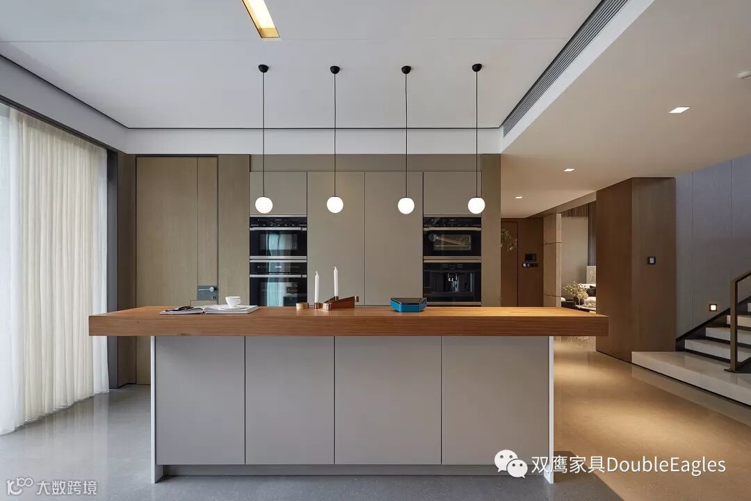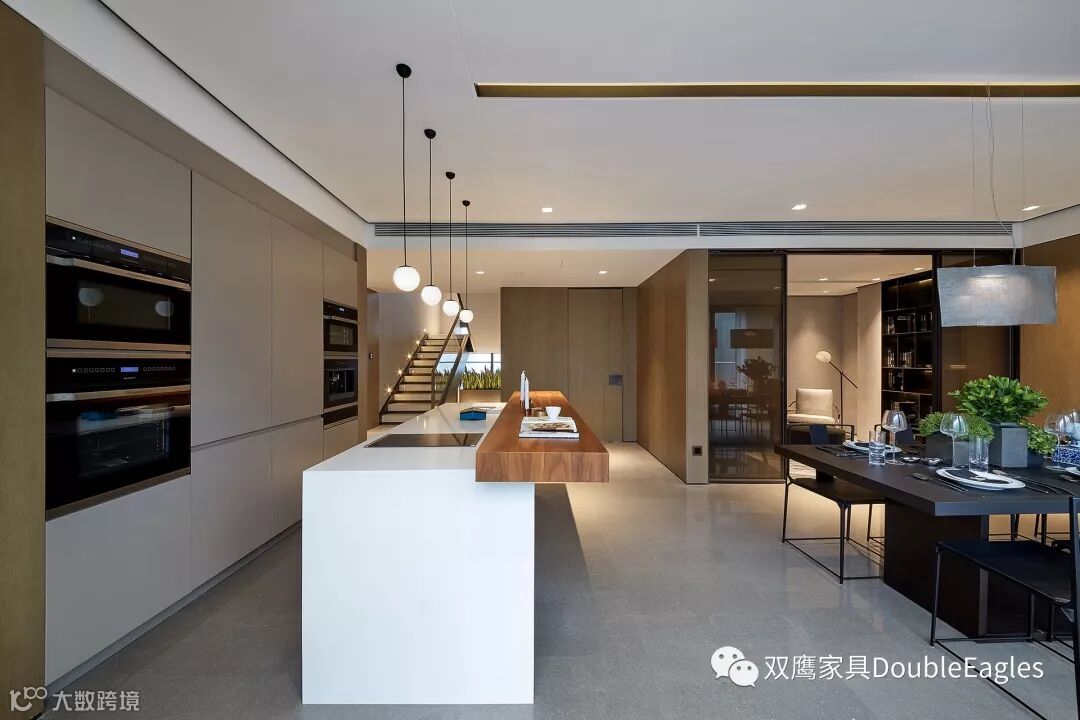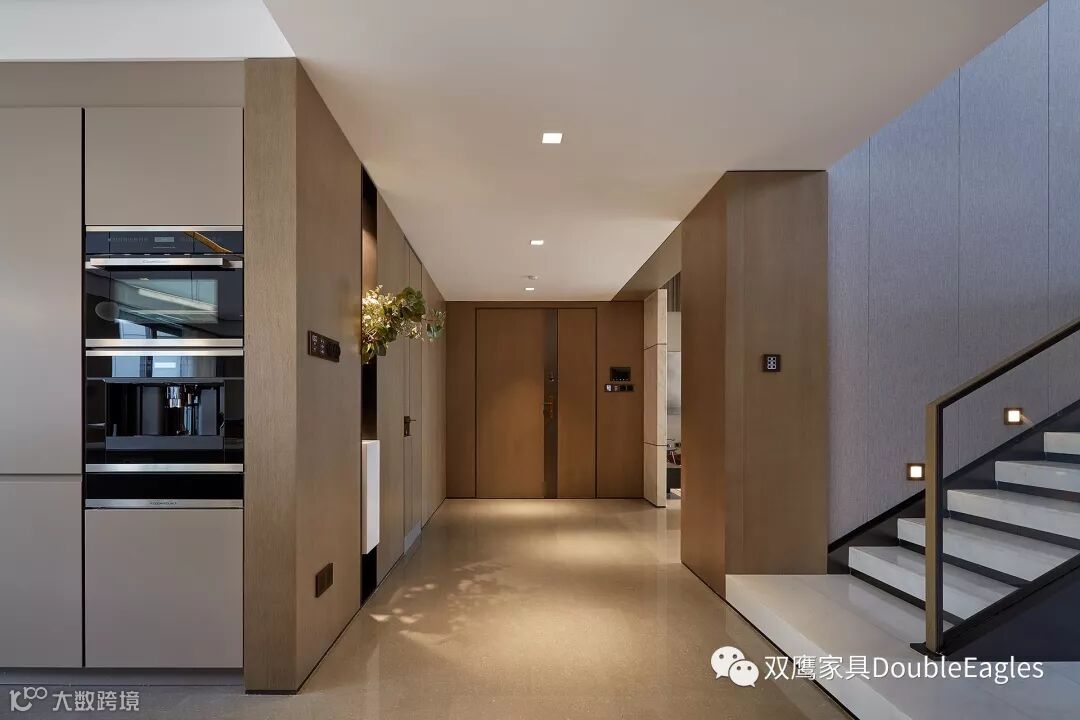 客厅往里走方为家中餐厅位置,透过新的设计思维将木饰面框架大量使用到墙体之中打破传统吧台桌在空间中的型态,让整体概念形成一道展示柜体结合机能型态的布局方式。