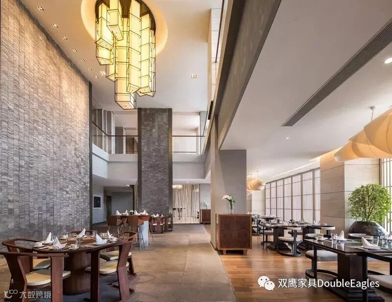 酒店餐厅大面积的墙面格栅搭配不规则的波浪形木质天花,两者的碰撞既实现空间的界定,又不影响视觉的穿透,丝丝木质特有的温度,让整个空间尽显华夏文明的隽秀之气。