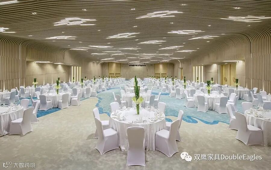 拒绝无趣,拥有新奇;酒店宴会厅内不规则的圆弧木质从墙面延伸至天花,每一处肌理都被精心设计,看似随意,实则灵动非凡;光与影、虚与实在这一方天地勾兑相融,营造出一种高雅的艺术氛围。