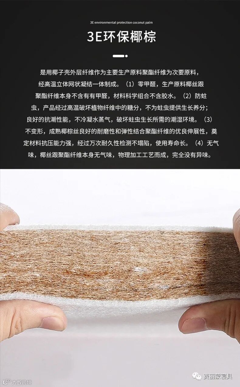 2、棕榈床垫山棕床垫:山棕床垫是长丝,绿色环保,弹性韧性较好,更加柔软,干爽透气,不吸水,不易生虫。 椰棕床垫:椰棕床垫是短丝,绿色环保,制作成本较低,硬度较硬,韧性较弱,受潮容易长虫子,还容易塌陷变形。总的来说棕榈床垫睡感偏硬,价格相对实惠,缺点是可能会容易生虫子,也有沾合胶水甲醛超标的情况。上一期有详细说明怎么选择椰棕床垫,有兴趣了解的朋友可以去了解一下,如何挑选一张合适的椰棕床垫链接:https://mp.weixin.qq.com/s/4YGy1N1-IlSPjc_AjTGzSw