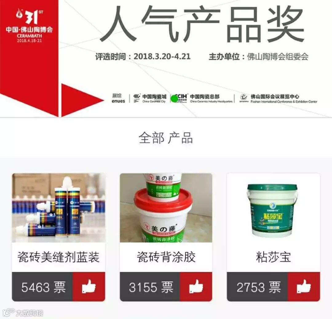 美之藤美缝剂,美缝剂斩获人气产品第一名,背涂胶斩获产品第二名,受到全国参展商的一致好评和支持。