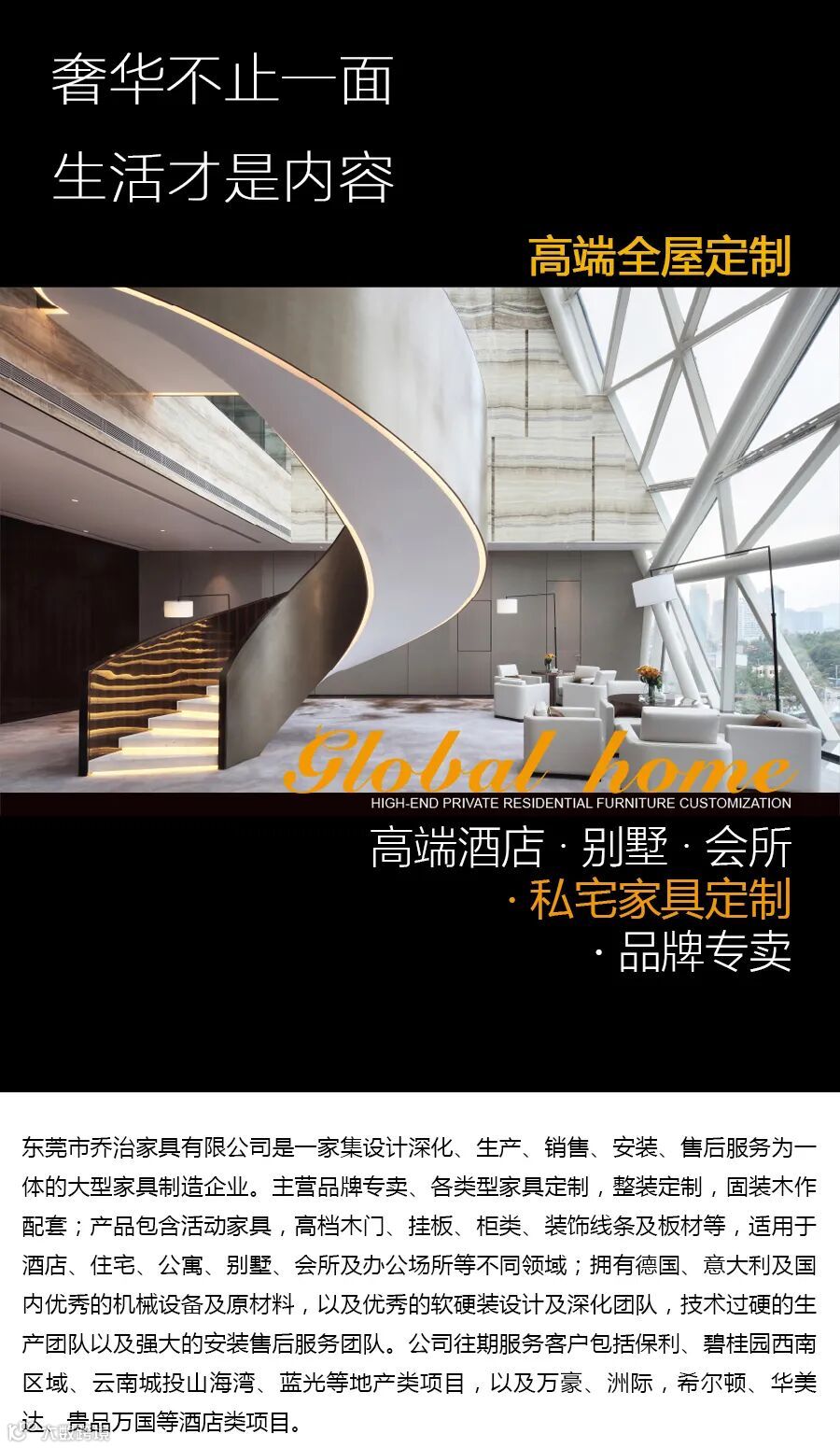 集设计深化、生产销售、安装售后等服务为一体的大型家具制造企业—东莞市乔治家具有限公司。30000平米生产线,主营各类型家具全案定制,专注于酒店、私宅、会所项目固装及活动家具定制。适用于住宅、酒店、地产、别墅、会所等领域。乔治家具,让所见更美