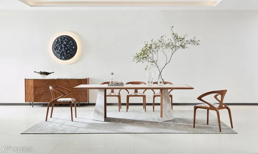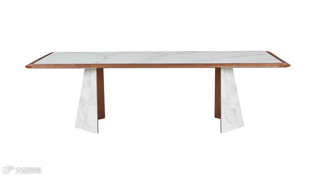 同样是以线条勾勒出局部细节的雕塑感,在桌面部分,无论长与圆设计师将桌面的切割打磨,参照石材雕塑所形成的截面设计,搭配大理石,端庄稳重又不失个性。
