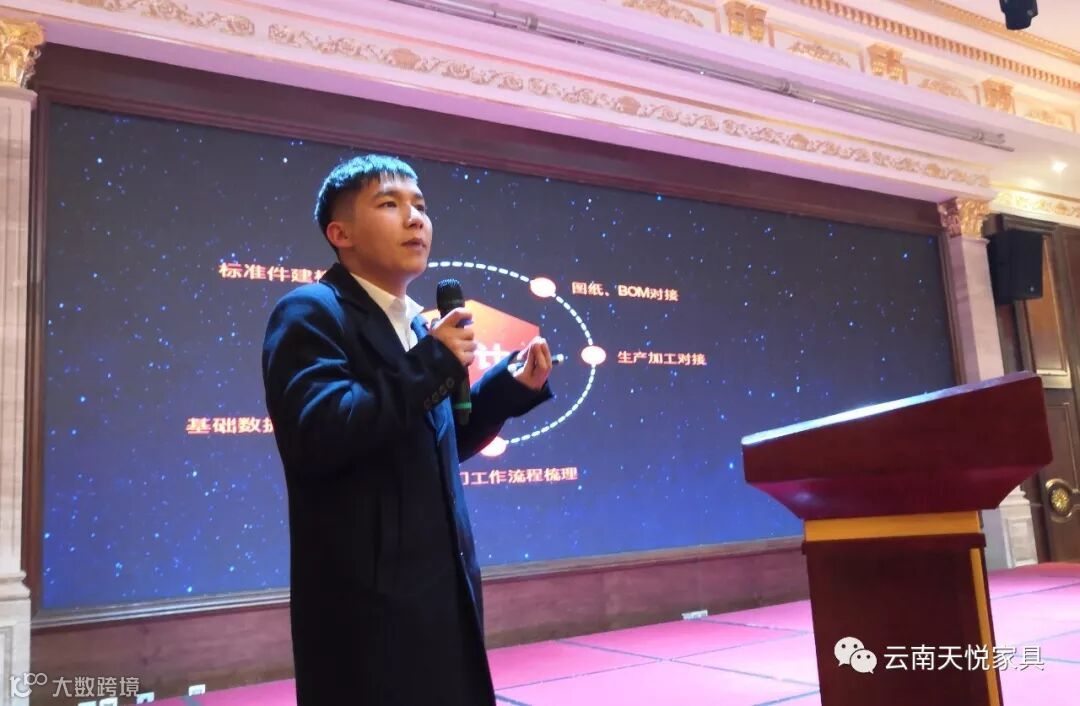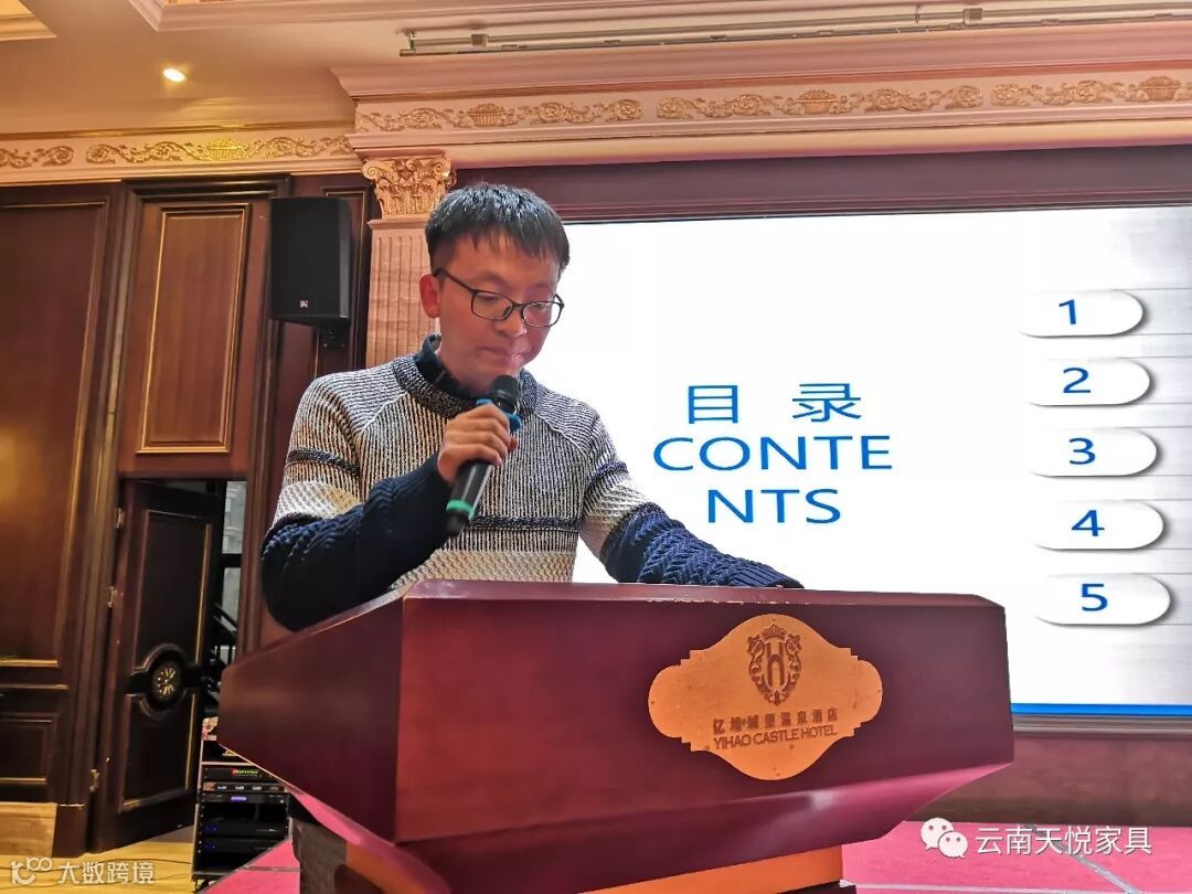 赵经理代表销售部作汇报;过去一年,我们销售部完成了几个核心工程单,包括今天我们举办晚会的亿壕温泉酒店。在2020年,销售部将增加销售渠道的开拓,拓宽业务来源,同时民用家具开发,有助于业绩的增长情况,把“天悦”品牌打造区域性品类第一。
