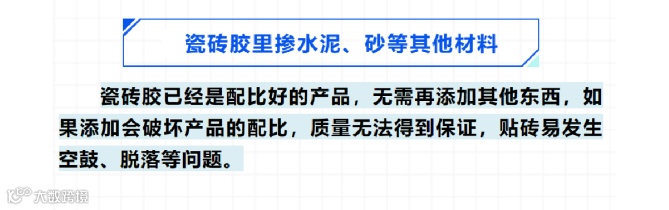 鉴于瓷砖胶的独特粘稠性,部分施工人员可能误以为加入水泥能改善施工体验,实则此举破坏了瓷砖胶的原有配比,严重削弱了其粘结力和耐久性。长期来看,这种做法极易导致瓷砖空鼓、脱落等问题。