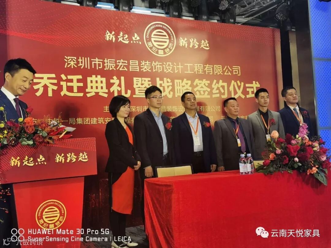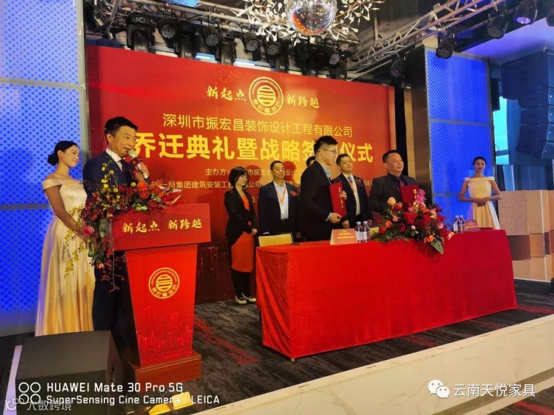 2020年元月2日,新年伊始,万象更新之际,深圳市振宏昌装饰设计工程有限公司在深圳举行主题为“新起点,新跨越——乔迁典礼暨战略签约仪式 ”盛大活动。云南天悦家具制造有限公司受邀参加仪式,生产中心张总代表天悦家具出席活动现场并签约战略合作伙伴协议!