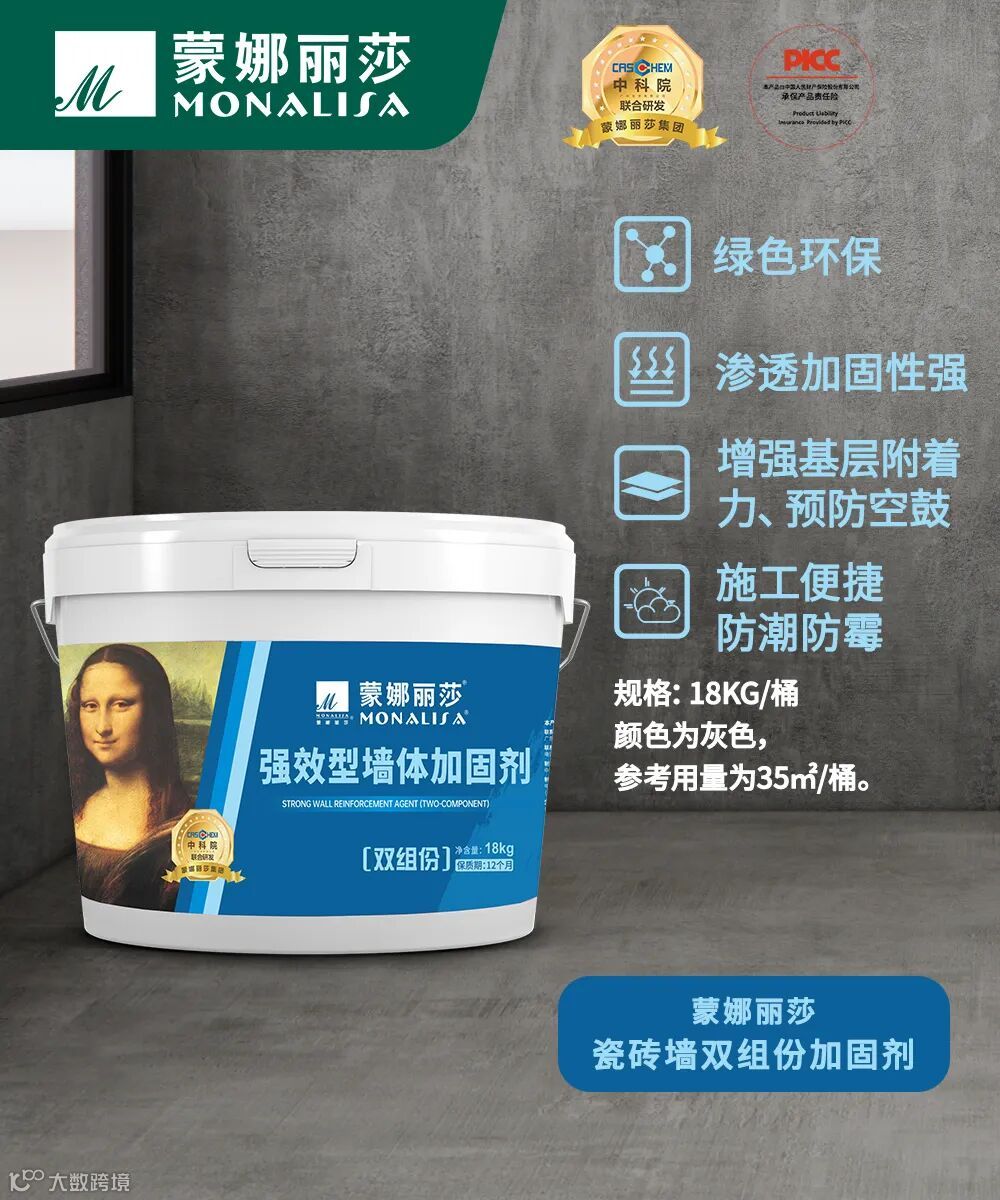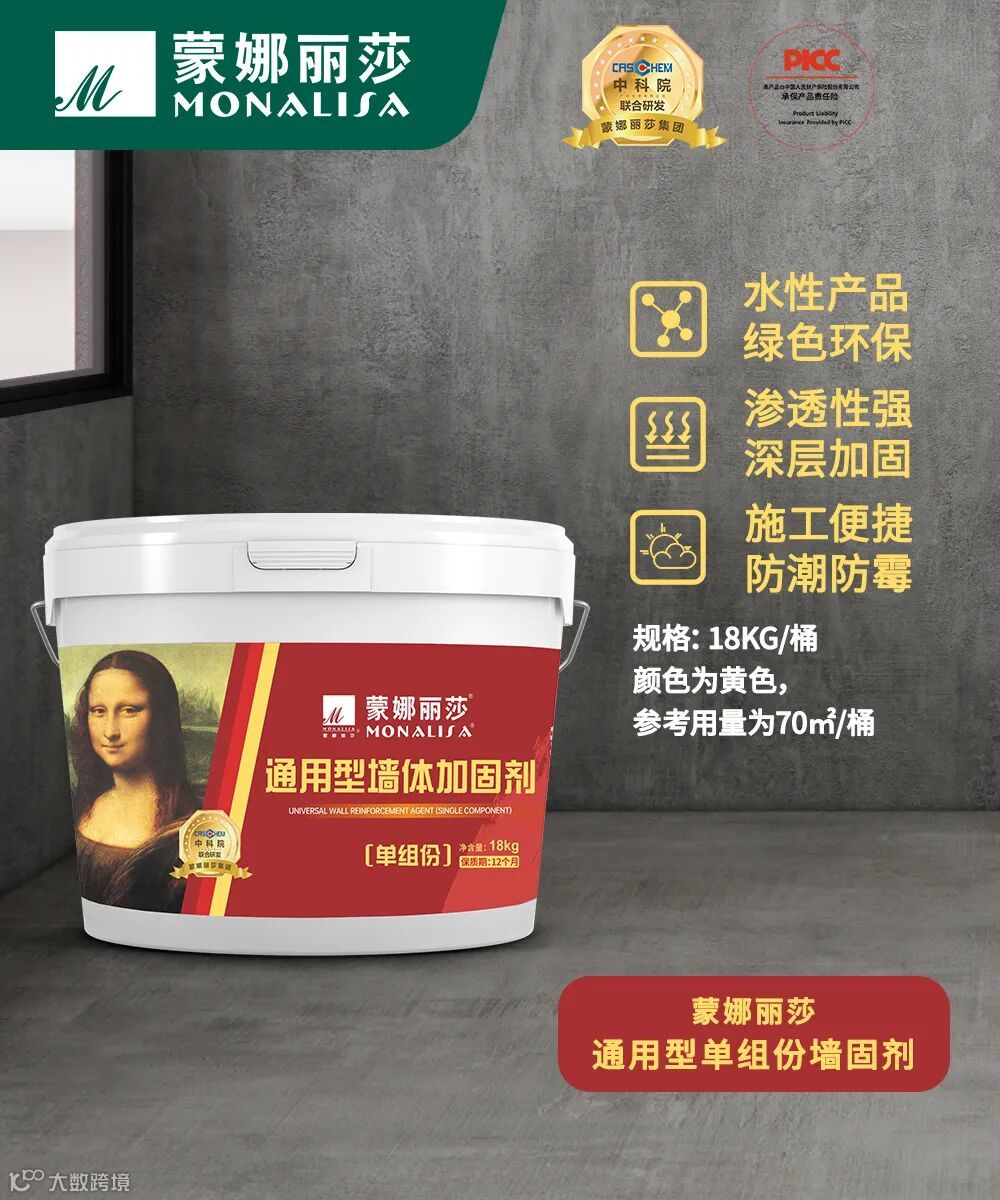 蒙娜丽莎强效型墙体加固剂是一种用于增强基层表面性能或赋予基层表面所需要的功能的双组分拉毛型表面处理材料。具有优异的渗透性,能充分浸润基层,使基层密实,提高基层界面附着力,有效防止找平层空鼓、开裂。