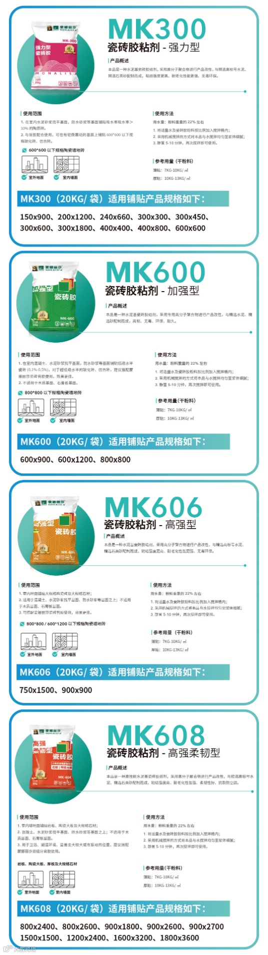 工匠活动讲解了蒙娜丽莎辅材全系列产品,其中重点讲解的是铺贴系列,铺贴系列分为瓷砖胶产品和背胶产品。蒙娜丽莎背胶类型分为MH301单组份背胶和MH302双组份背胶。蒙娜丽莎瓷砖胶类型分为MK300、MK600、MK606、MK608,而MK608作为大板岩板专用型瓷砖胶,执行标准也是达到C2TES1,更是获得了2021-2022年度中国瓷砖粘结行业的年度“金砂奖”。