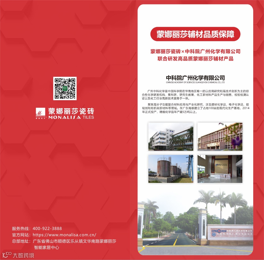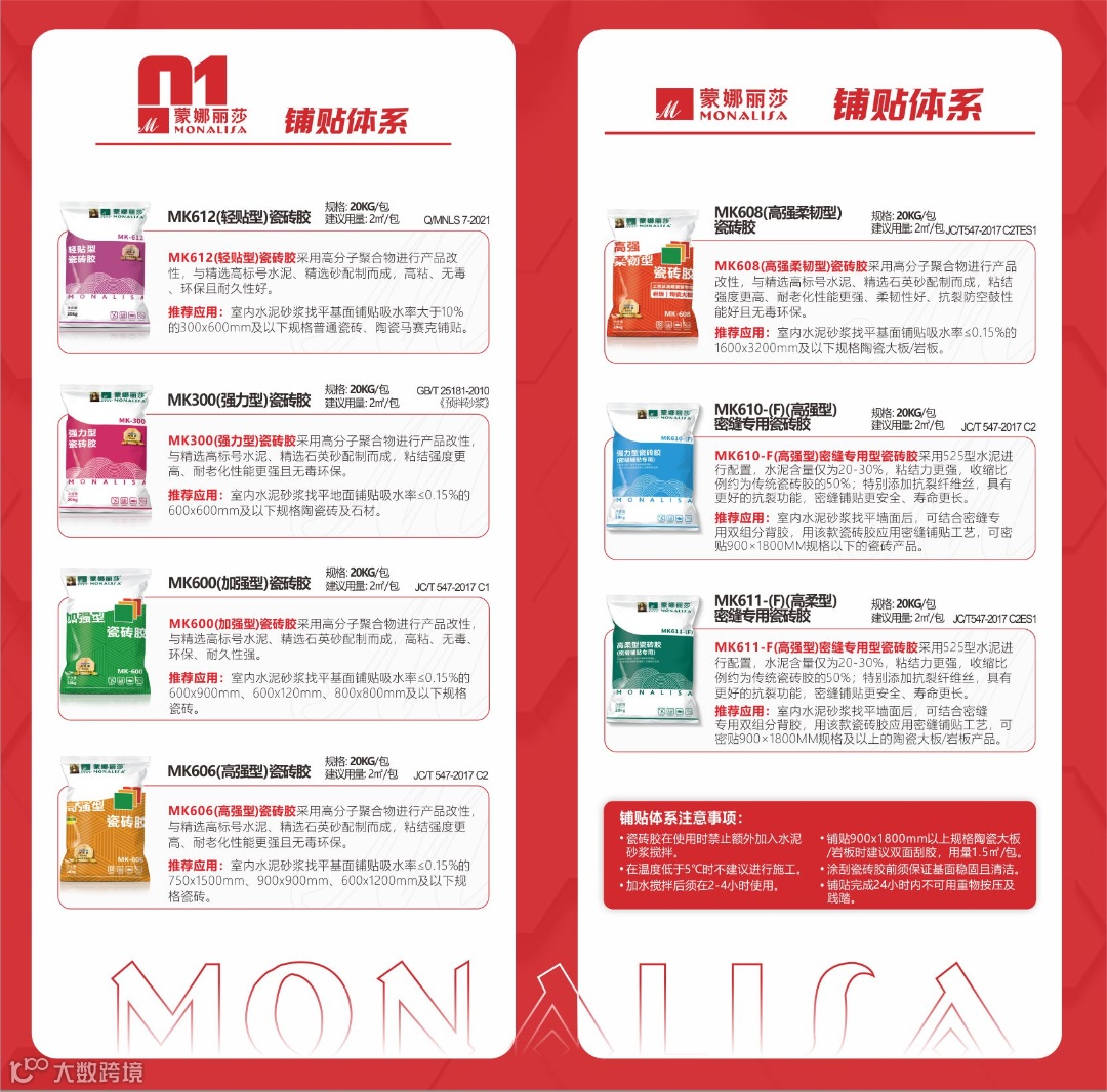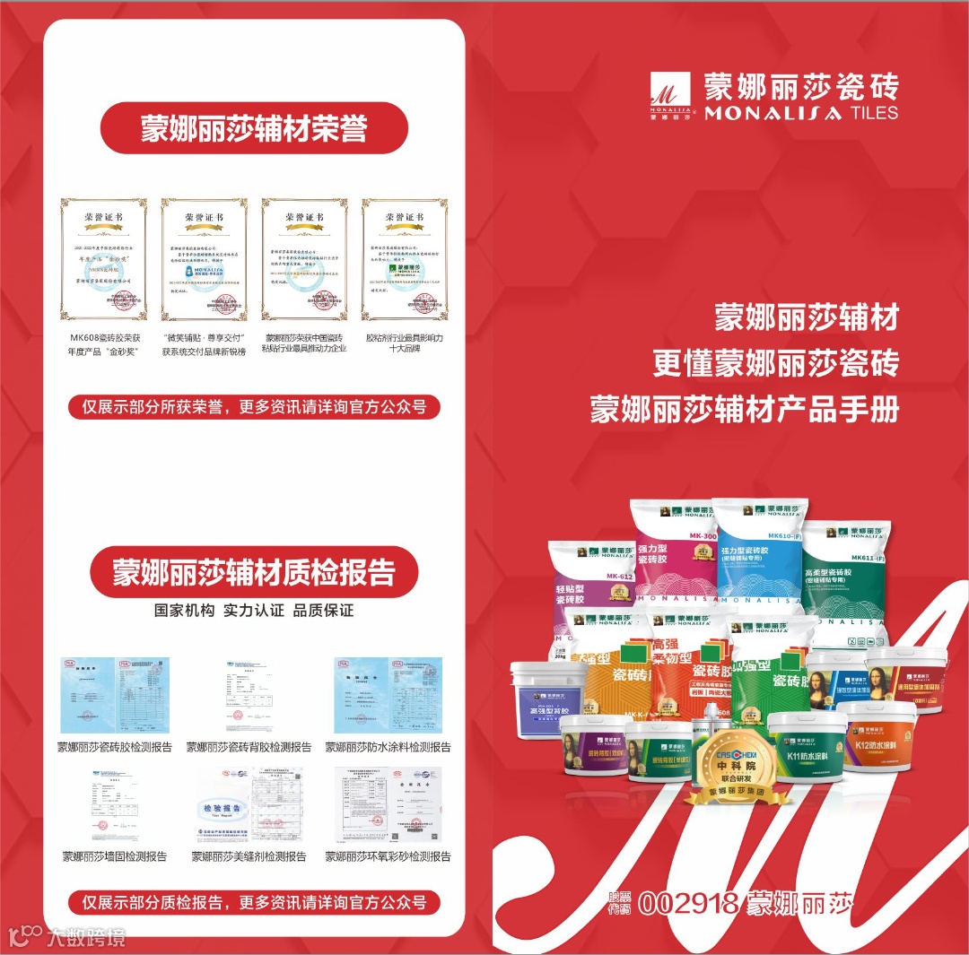蒙娜丽莎辅材,是由蒙娜丽莎集团与中科院广州化学有限公司强强联合所研发生产的辅材产品。以蒙娜丽莎的行业沉淀与中科院的雄厚技术为产品保障,以“更健康、更安全、更耐久”的产品定位,服务于家装与工装渠道的瓷砖铺贴、美缝、防水、清洁等应用场景。