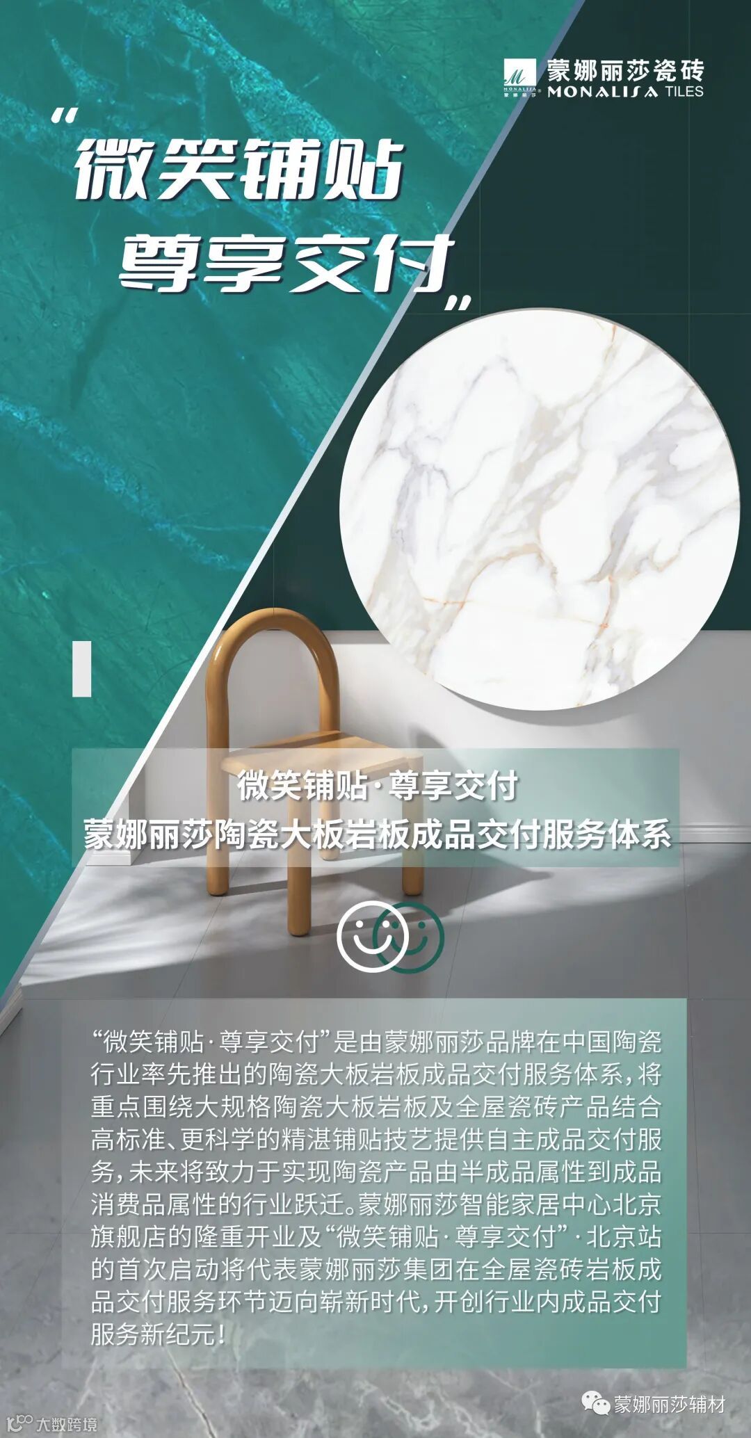 “微笑铺贴·尊享交付”是由蒙娜丽莎品牌在中国陶瓷行业率先推出的陶瓷大板岩板成品交付服务体系,将重点围绕大规格陶瓷大板岩板及全屋瓷砖产品结合高标准、更科学的精湛铺贴技艺提供自主成品交付服务,未来将致力于实现陶瓷产品由半成品属性到成品消费品属性的行业跃迁,将代表蒙娜丽莎集团在全屋瓷砖岩板成品交付服务环节迈向崭新时代,开创行业内成品交付服务新纪元!