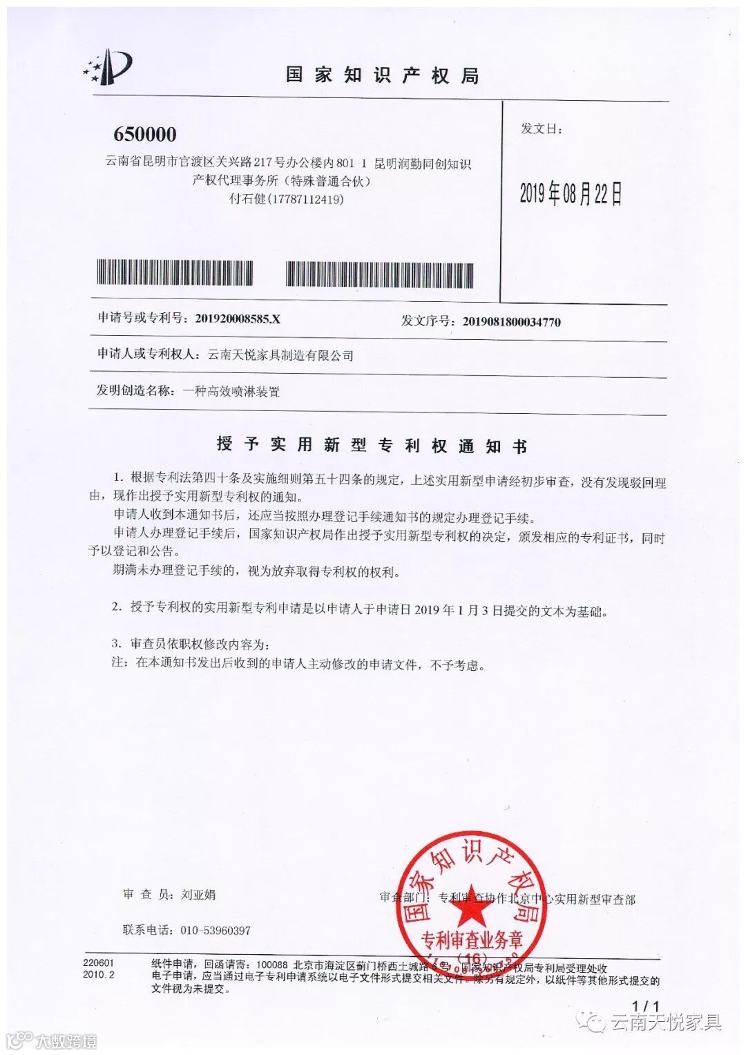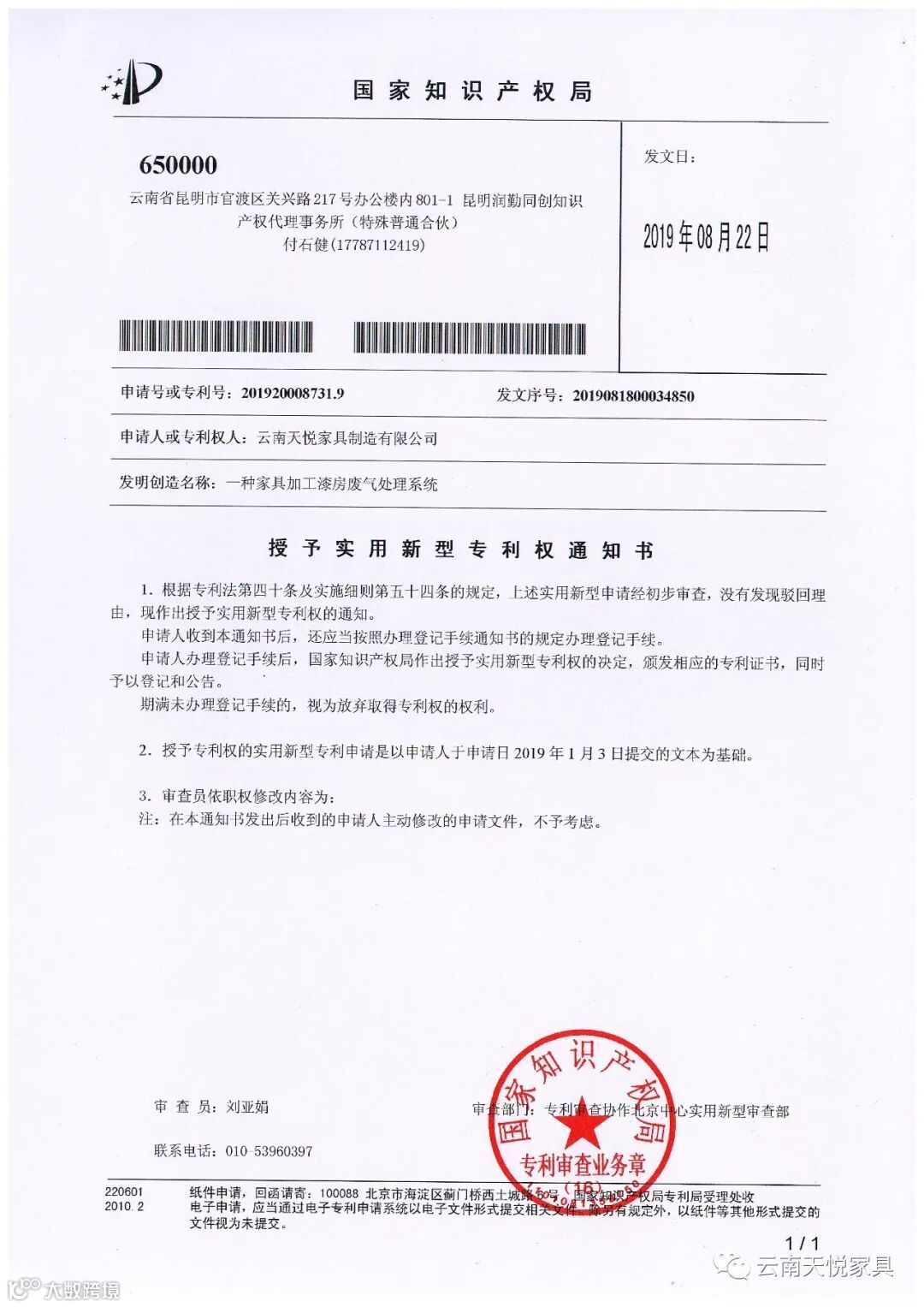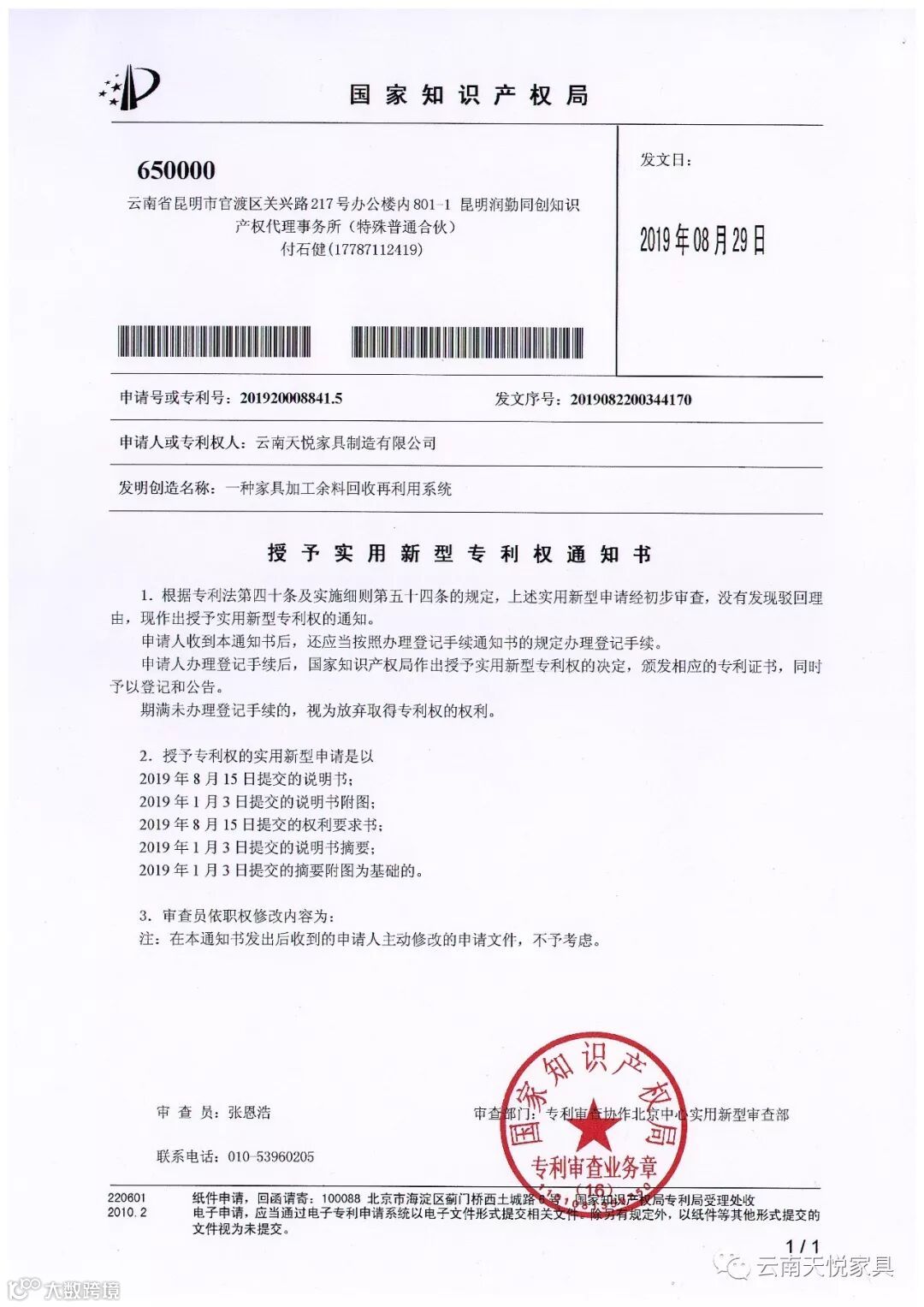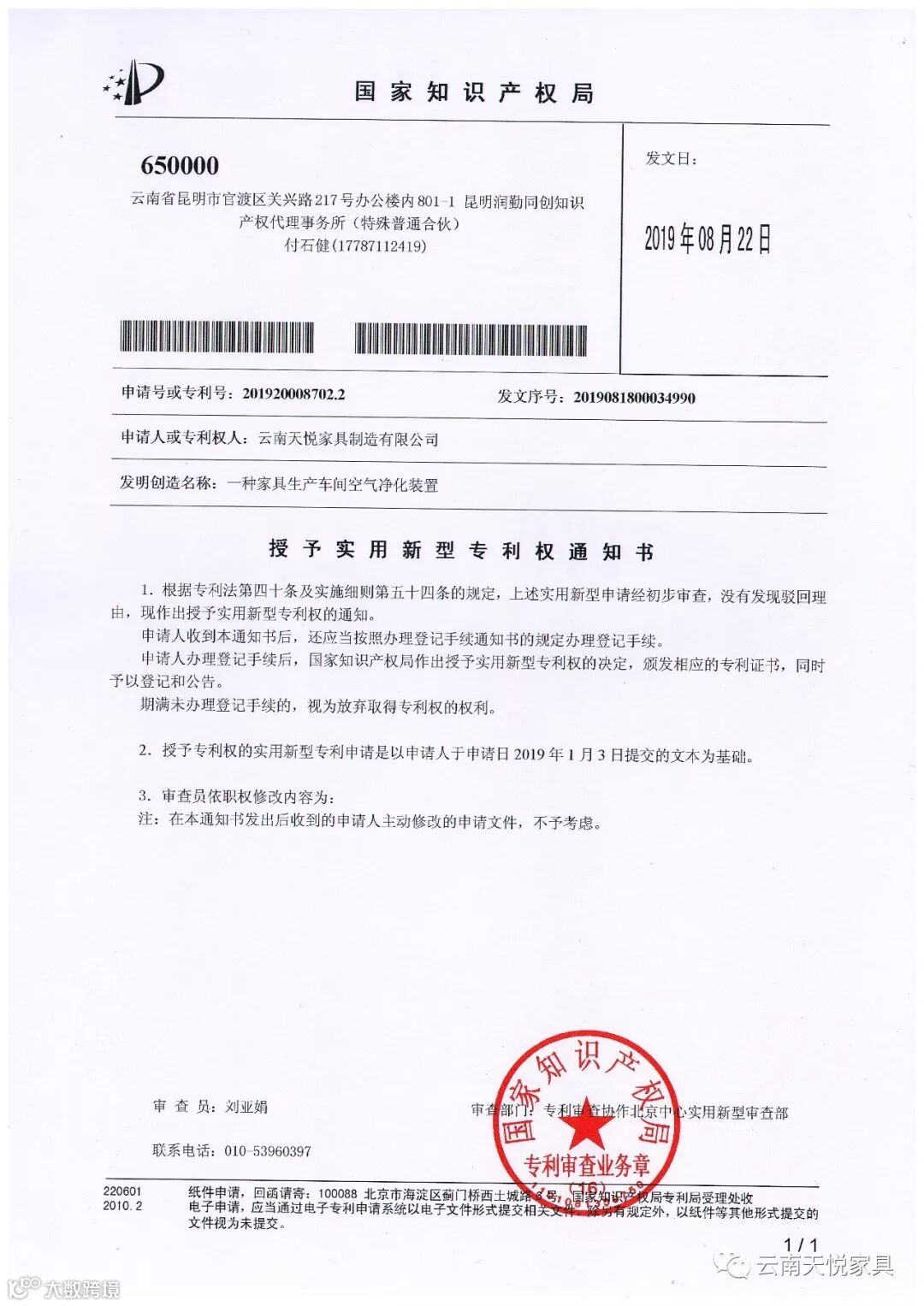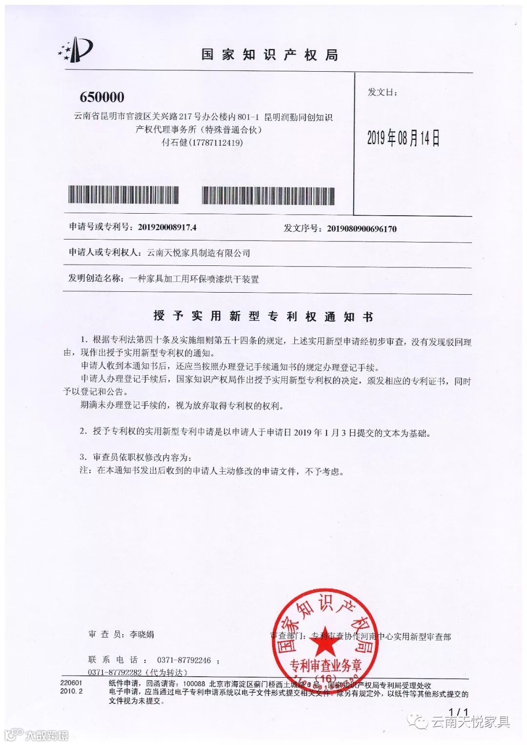 导读:金秋8月,天悦家具五个新型实用专利专利经由国家知识产权局审批通过,被授予专利证书。