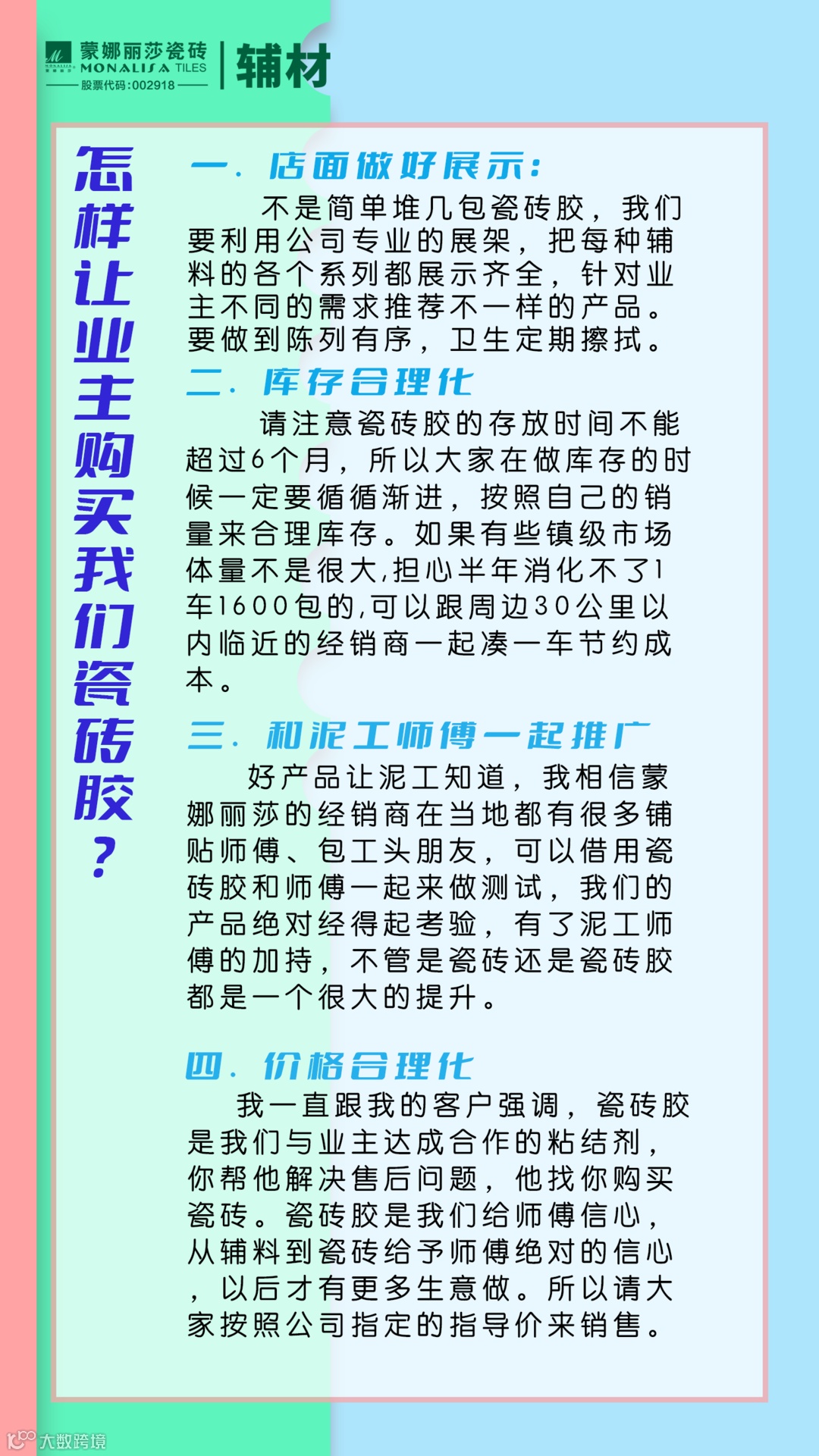 更多专业科普和瓷砖铺贴技术敬请留意蒙娜丽莎辅材公众号和蒙娜丽莎会员之家视频号直播间!