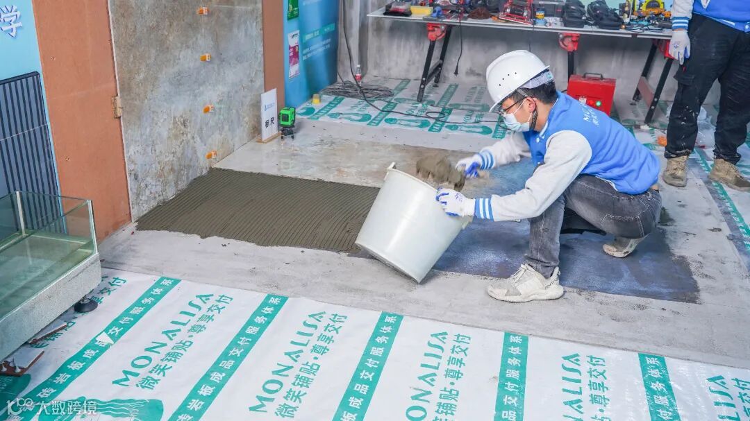 铺贴工艺展示环节分为两个部分,一是使用蒙娜丽莎辅材最新产品“柔性挂贴胶”进行干法施工瓷砖上墙铺贴,二是采用蒙娜丽莎最高规格瓷砖胶产品“MK608”进行湿法施工地面铺贴。