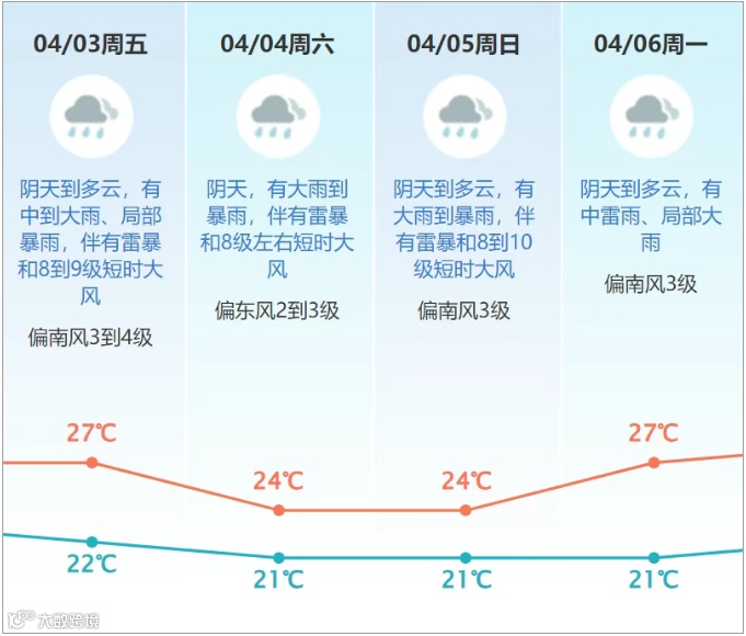 您好!气象台预计:东莞4月3-6日受低槽影响,将有持续强雷雨天气过程,并伴有短时强降水、8到10级,局部11级短时大风、冰雹等强对流天气。 4月3日,有中到大雨局部暴雨,伴有雷暴和8到10级短时大风。清明假期天气:4月4日大雨到暴雨、局部大暴雨,伴有雷暴和8级左右短时大风,4月5日大雨到暴雨,伴有雷暴和8到10级短时大风。4月6日中雷雨、局部大雨。注意防御!为保障您的人身财产安全,观山客户服务中心温馨提醒您: