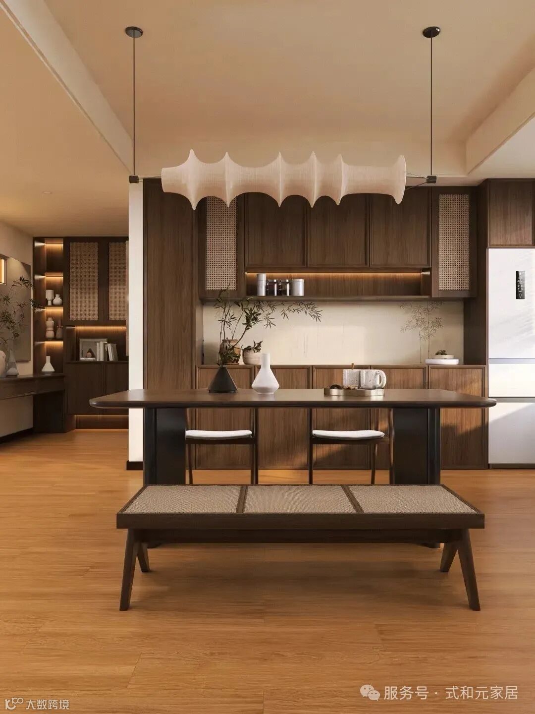 温润的木质餐桌,搭配简约座椅与长凳,线条流畅自然。桌上素雅花瓶插着几枝清竹,寥寥数笔,勾勒出自然意趣,尽显宋式美学的极简与雅致。