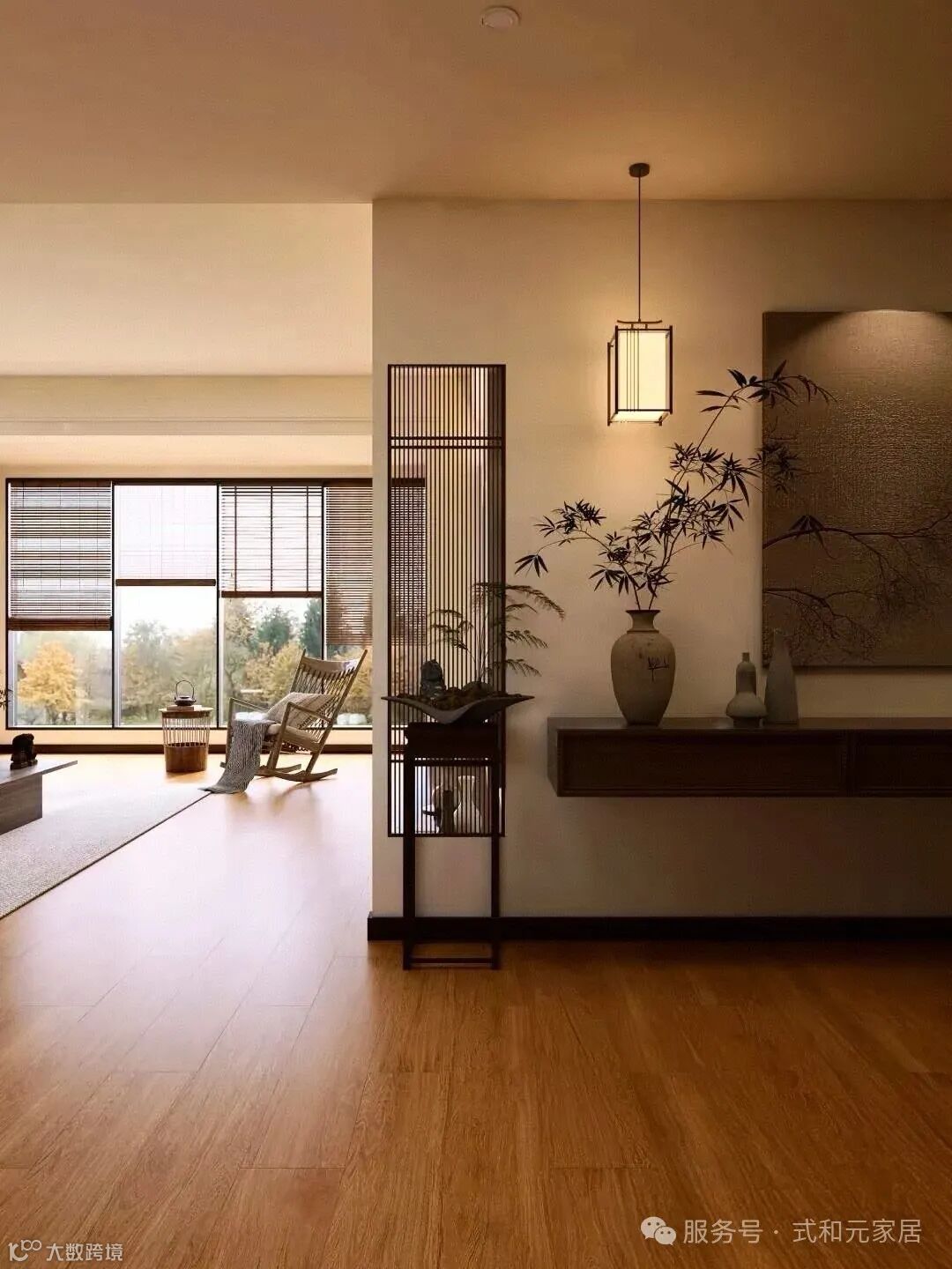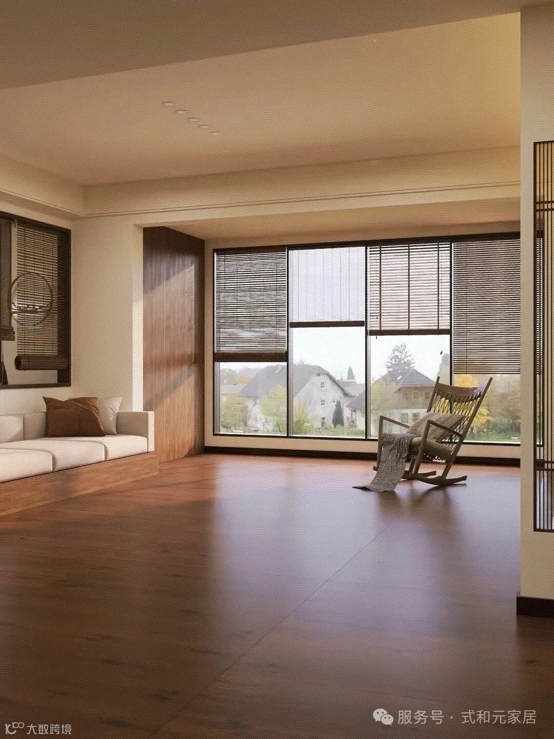 踏入这间客厅,仿若穿越回风雅的宋朝。简约木质地板,质朴自然,似承载着岁月的沉静。格栅屏风,线条利落,透着宋式的精巧与雅致。一盏简约吊灯,光影柔和,勾勒出空间的静谧轮廓。案几之上,古朴花瓶插着几枝竹,清逸之姿,尽显宋画般的留白意境。远处摇椅,搭配素色织物,于窗前静候,窗外树影斑驳,引入自然之韵。整个空间,摒弃繁复,以简为美,将宋式美学的含蓄、内敛与对自然的崇尚,悄然融入每一寸角落,营造出一方诗意栖居之所。