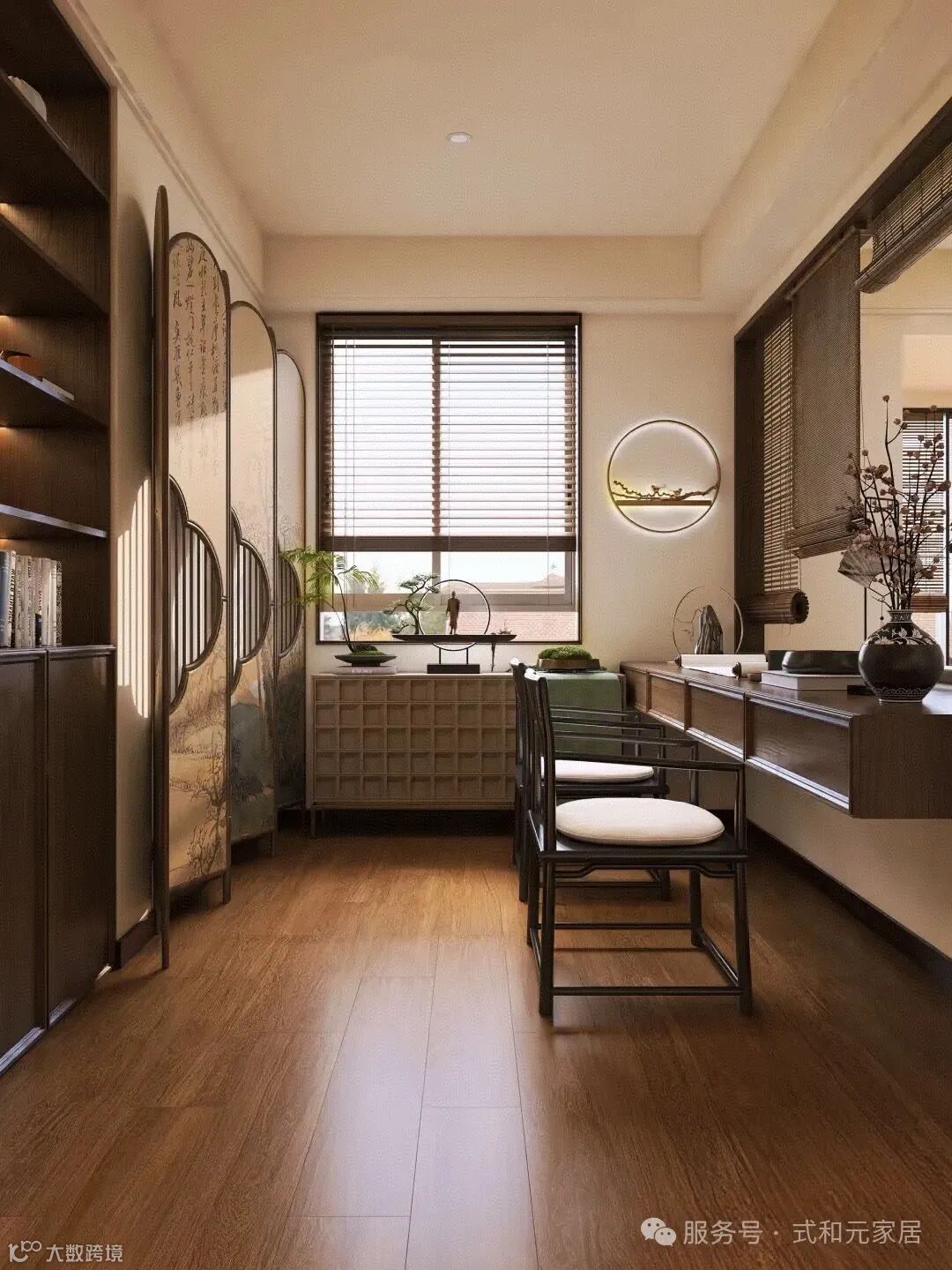 书房一侧,中式屏风伫立,其上书法与山水墨韵晕染,似在诉说着千古风雅。屏风旁,书架沉稳而立,古籍与雅器有序陈列,每一件都藏着故事。窗边矮柜之上,绿植与文房雅玩相映成趣,于古朴中添了几分生机。
