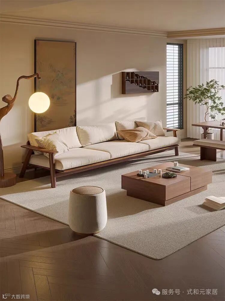 客厅主色调为米白与淡青,恰似宋代水墨画中常见的色彩,柔和且宁静。墙面大面积留白,仅挂着一幅意境悠远的山水画卷,墨色浓淡之间,尽显山川的灵动与静谧,仿佛将自然山水引入室内。