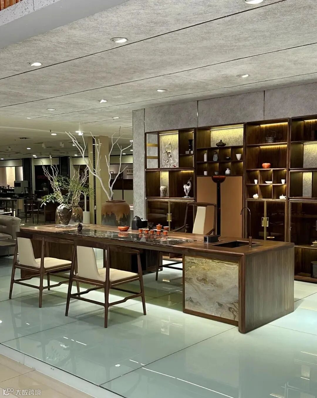 融入现代智能系统:隐藏式音箱播放古琴曲,电陶炉替代炭火煮水。墙面嵌入壁龛,展示茶器收藏,强化“茶禅一味”氛围。
