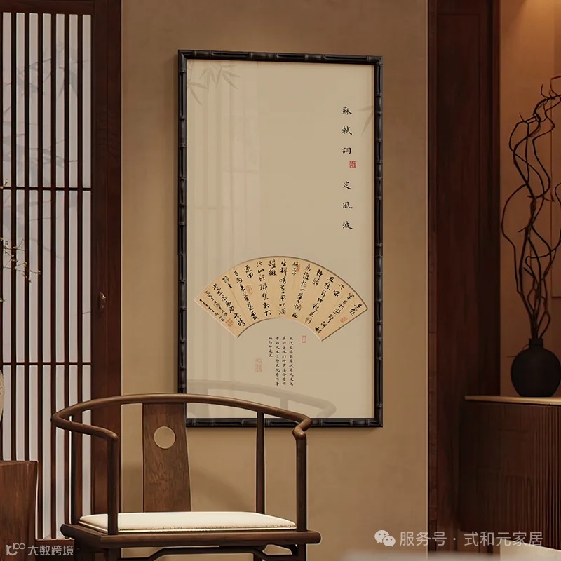 选择仿古宣纸微喷复刻名画(如范宽《溪山行旅图》局部),搭配深木色细框