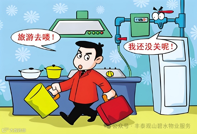 请不要在无人的情况下使用电热炉、电吹风、电磁炉等电器,注意人走切断电源。长时间外出时,请关闭水、电、气的总阀。