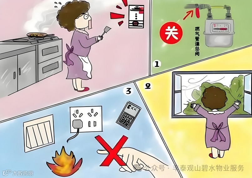 在室外安全地带拨打燃气公司24小时服务电话报告情况,必要时请报警求助。