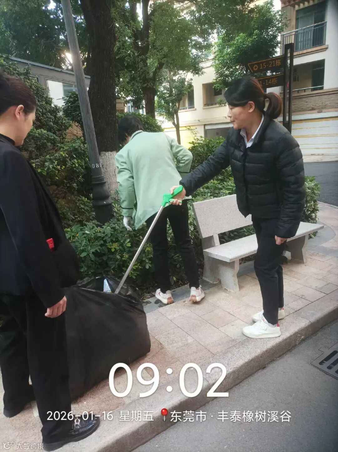 服务中心组织小区绿化带捡白色垃圾