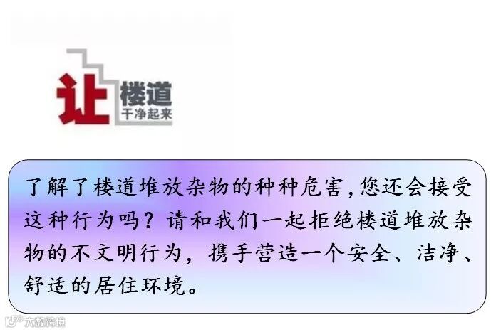 小区楼道是公共消防通道,将杂物堆放在楼道内,不仅影响日常通行还存在安全隐患。根据《消防法》相关规定:“任何单位、个人不得占用、堵塞、封闭疏散通道、安全出口、消防车通道”。为保障业主居住安全及公共秩序,让我们一起拒绝堵塞楼道的不文明行为。