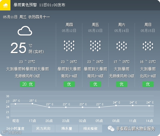 您好!根据东莞气象部门预计我市8-10日有阵雨或雷阵雨,间中雨势较大;11-13日受高空槽及冷空气影响,有暴雨到大暴雨、局部特大暴雨降水过程,该次过程具有降水强度大、持续时间长,请注意防御。为保障您的人身财产安全,丰泰观山碧水客户服务中心温馨提醒您: