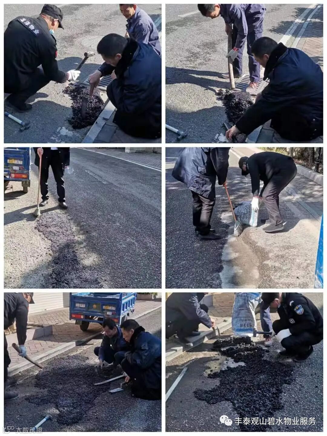 3、工程人员及保安人员对小区不平的路面进行维修。