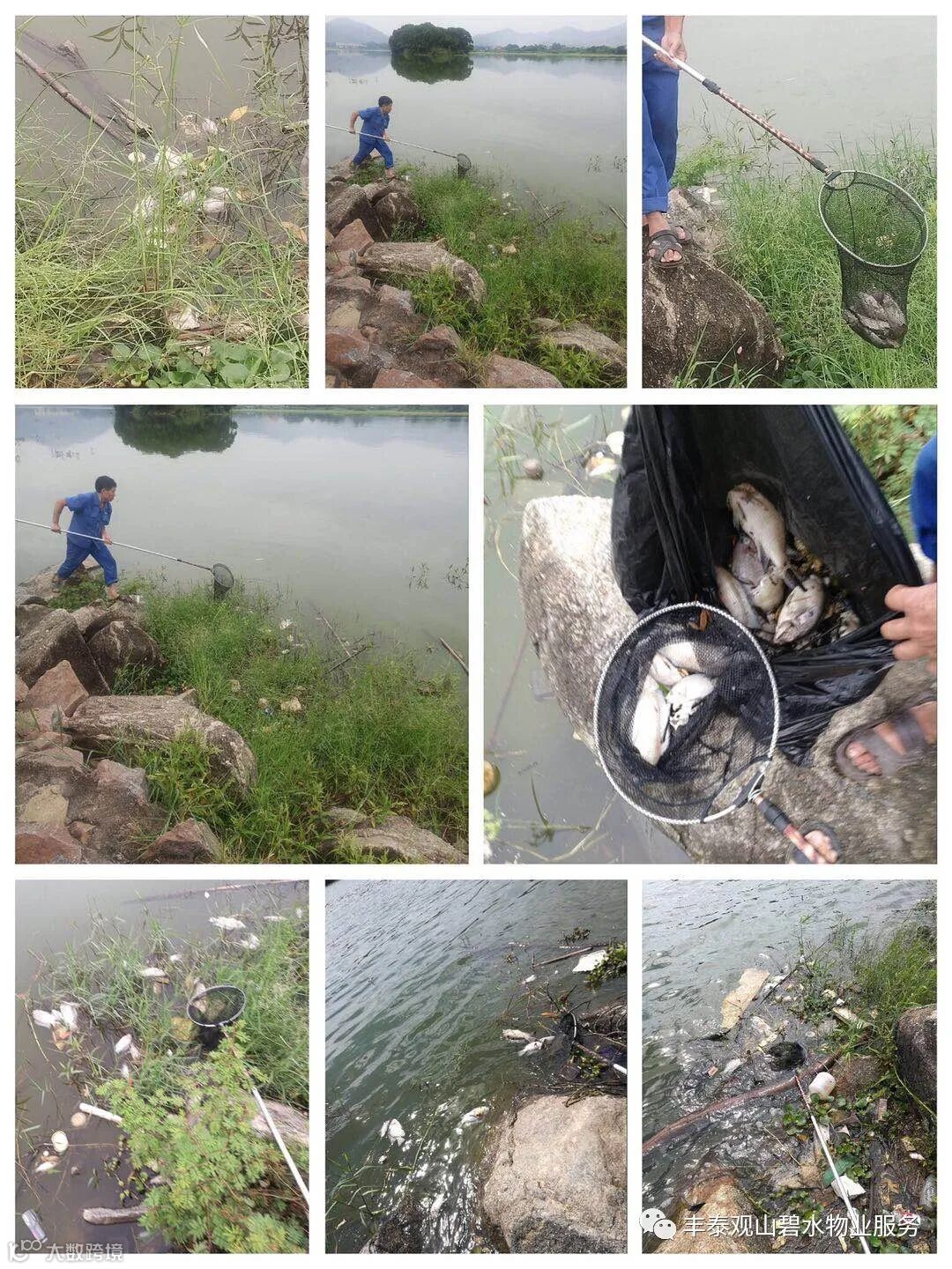 2、对湖面杂物及水库周边死鱼进行打捞,避免因天气炎热导致腐烂发臭造成污染。