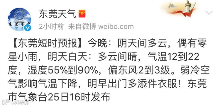 @东莞天气在今天下午也发了微博,受弱冷空气影响,明天气温12到22度,提醒大家明早出门多添衣服。