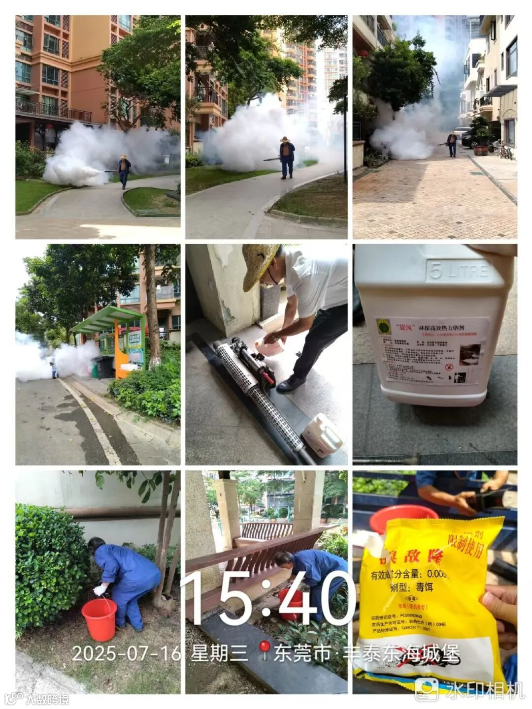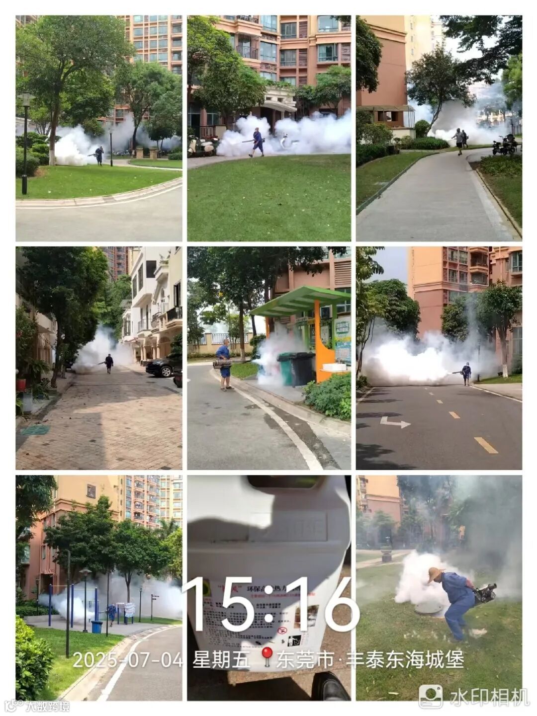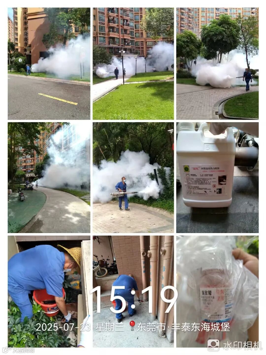 目前正值高温多雨季节,导致蚊虫滋生活跃,相关地区报告基孔肯雅热确诊超两千例,该疾病主要通过白纹伊蚊(俗称“花蚊子”)叮咬传播,为预防基孔肯雅热疾病,东海城堡客户服务中心开展了密集消杀工作。