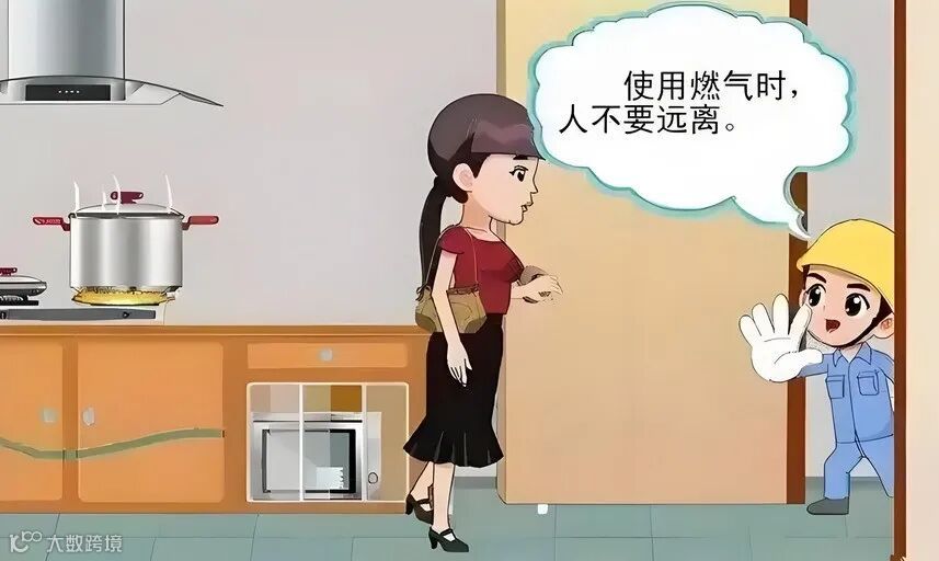 在使用灶具过程中,人不能远离,防止因沸汤溢出或风吹引起灶具熄火引发燃气泄漏。