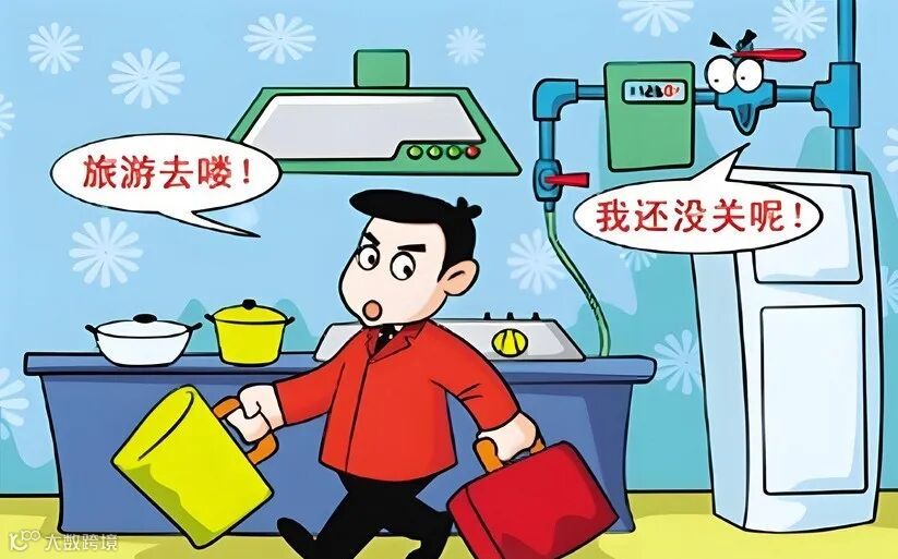 请不要在无人的情况下使用电热炉、电吹风、电磁炉等电器,注意人走切断电源。长时间外出时,请关闭水、电、气的总阀。