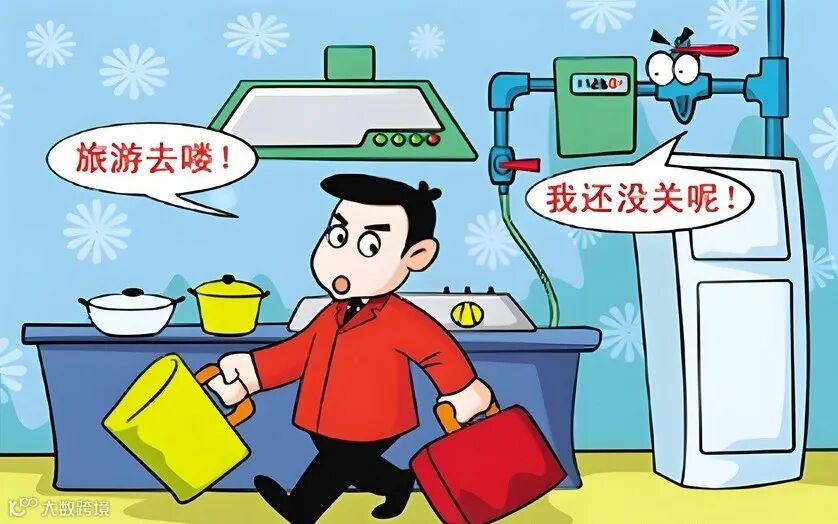 在使用灶具过程中,人不能离开,防止因沸汤溢出或风吹引起灶具熄火,导致燃气泄漏。