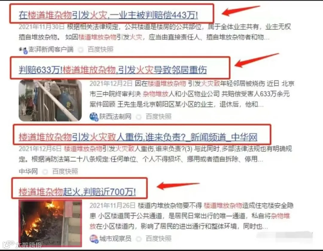 2017年安徽省合肥市金寨路一小区因楼道内堆放的杂物、废弃纸盒被烟头点燃发生火灾,所幸物业人员处理及时,没有造成人员伤亡。