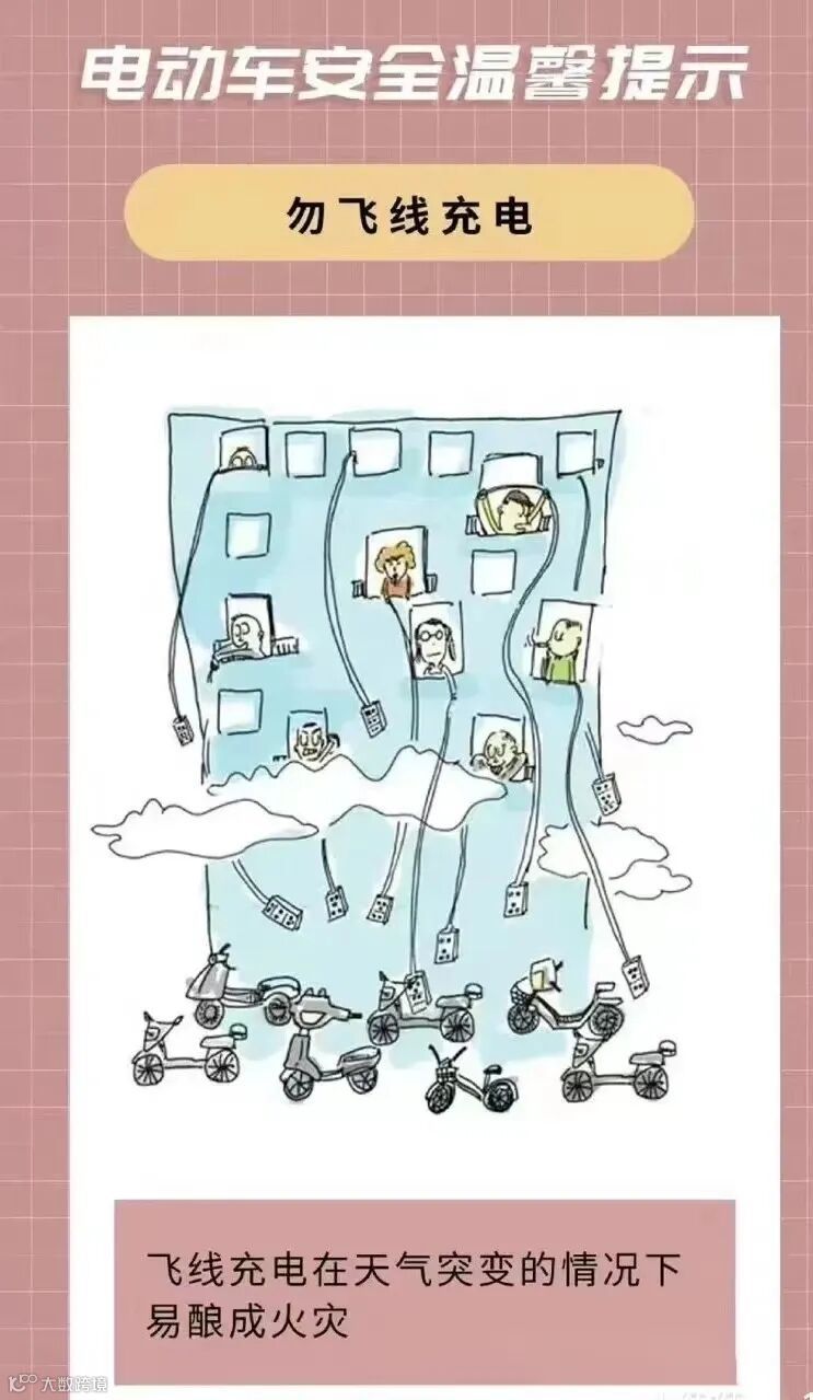 再次温馨提示各位业主:禁止电动车停放地库,禁止电动车上楼,不要在楼梯间、过道或者房间室内充电,禁止飞线充电。消除安全隐患,避免险情发生!